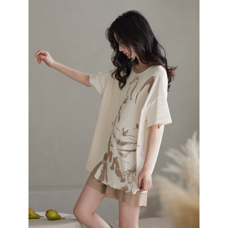 带胸垫睡衣女夏天短袖纯棉可外穿兔子印花凉感型薄款家居服套装