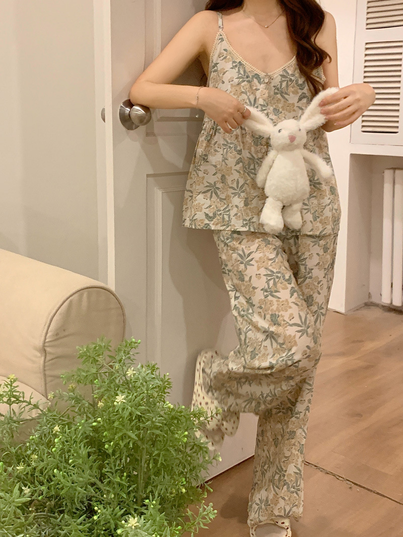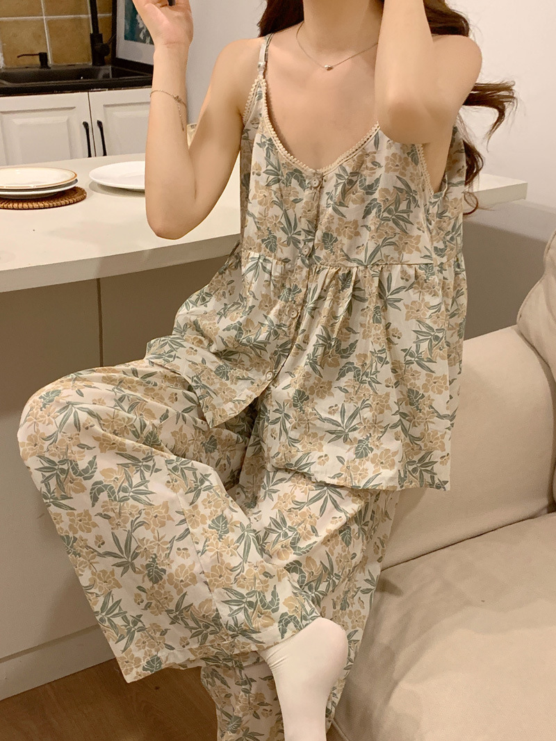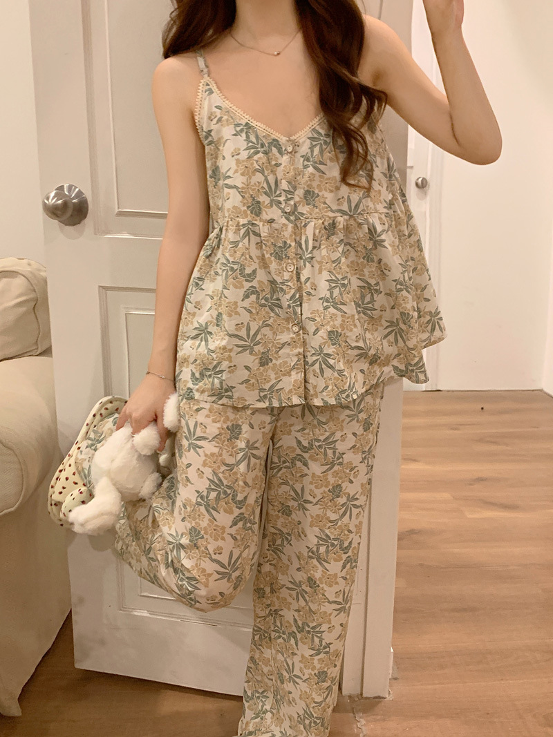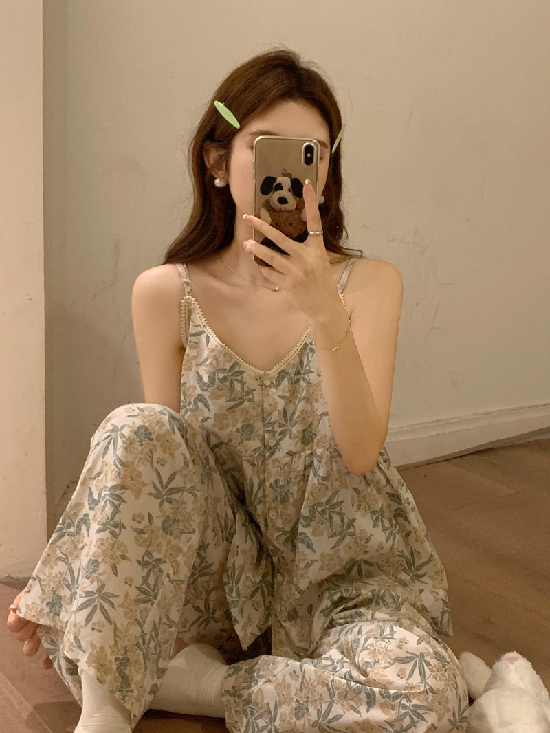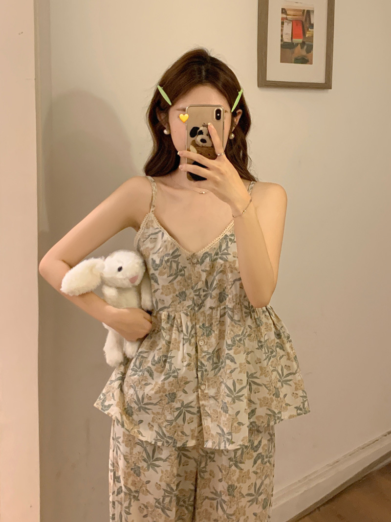 吊带睡衣女夏季长裤韩版性感甜美V领碎花全棉棉布家居服两件套装