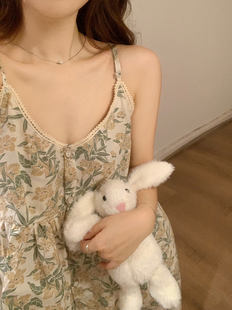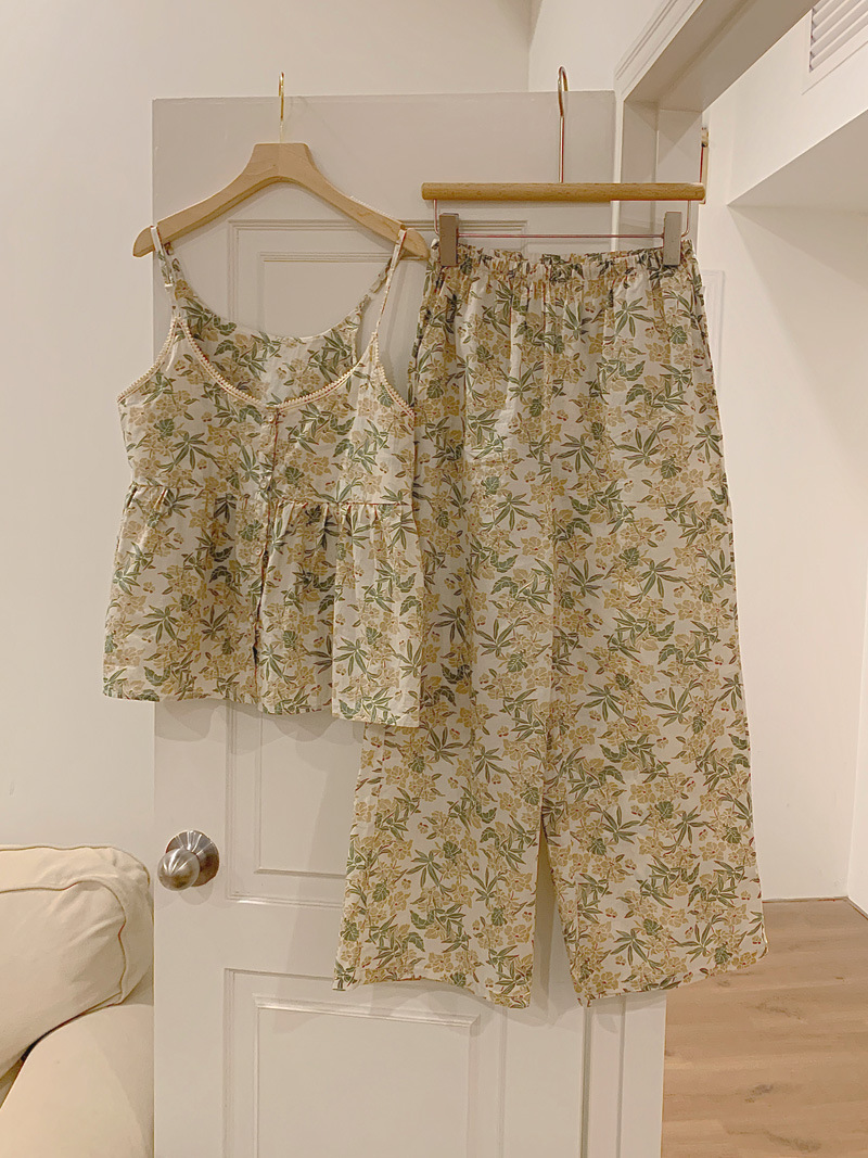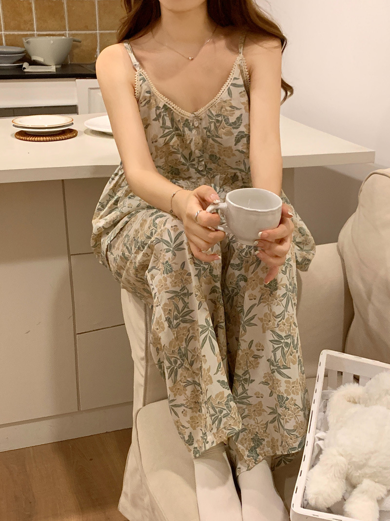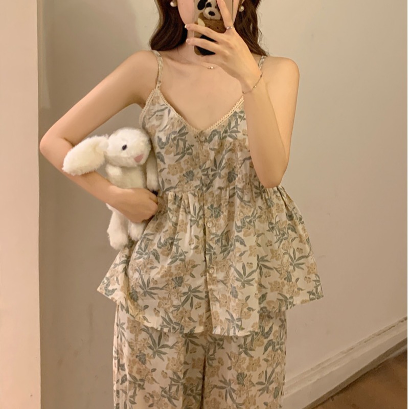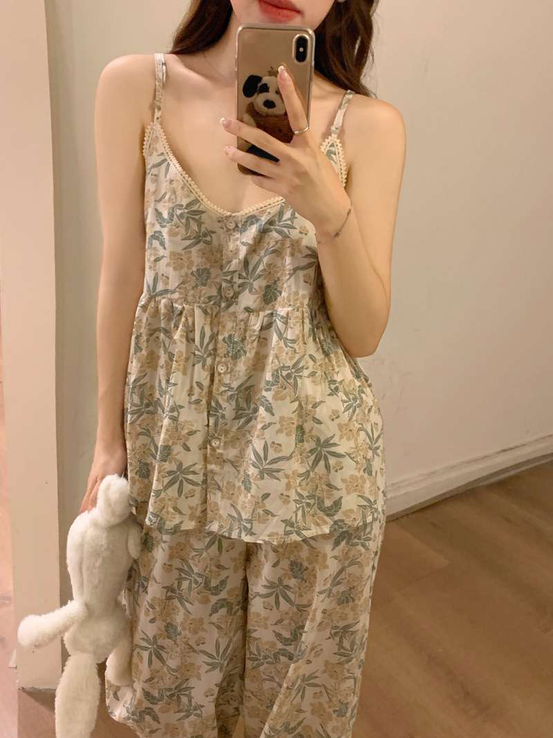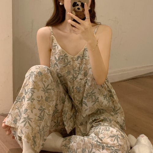 吊带睡衣女夏季长裤韩版性感甜美V领碎花全棉棉布家居服两件套装