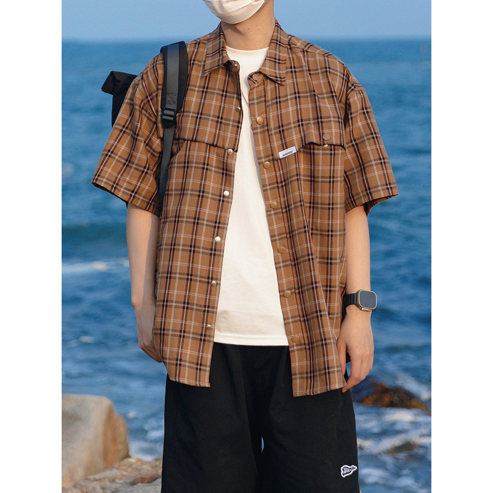 日系复古小众格子短袖衬衫男夏季新款宽松潮流休闲衬衣外套