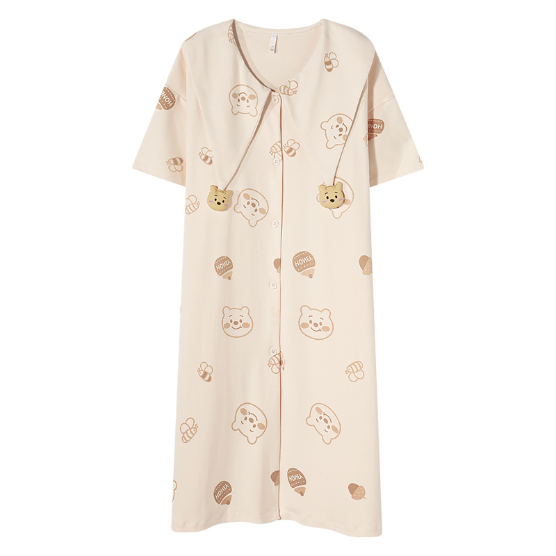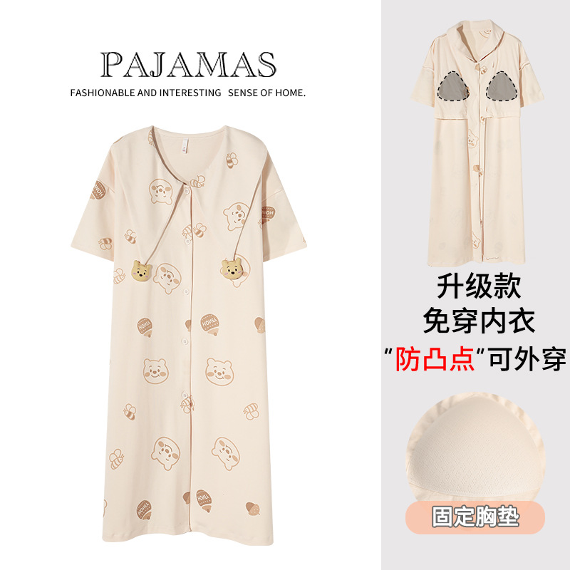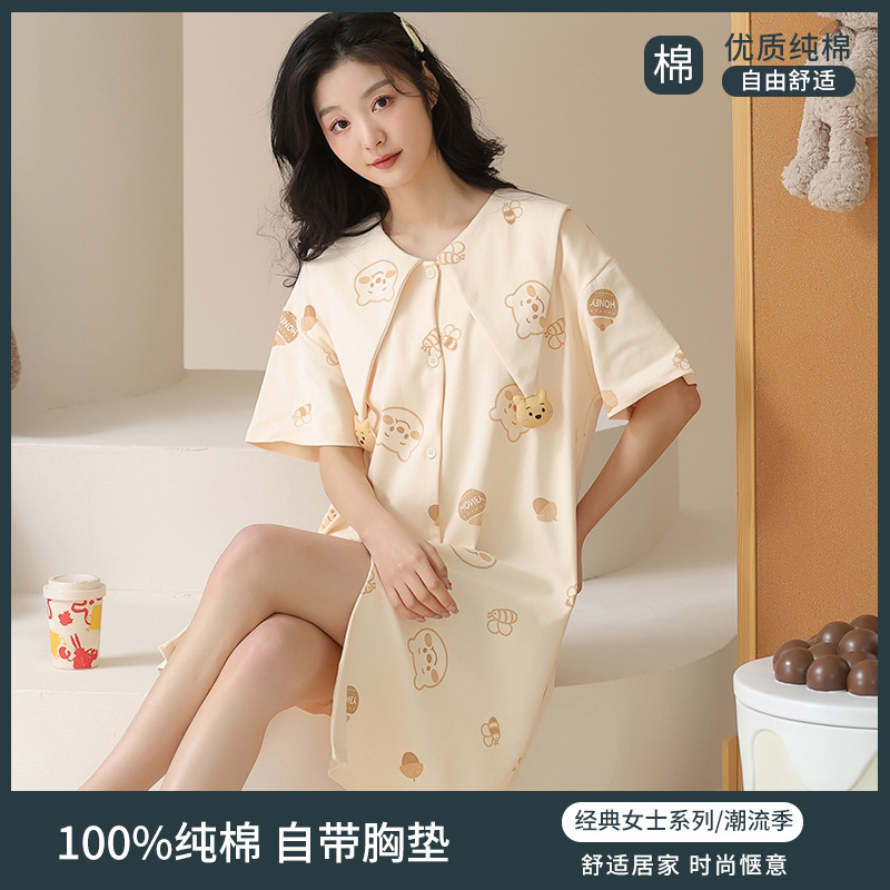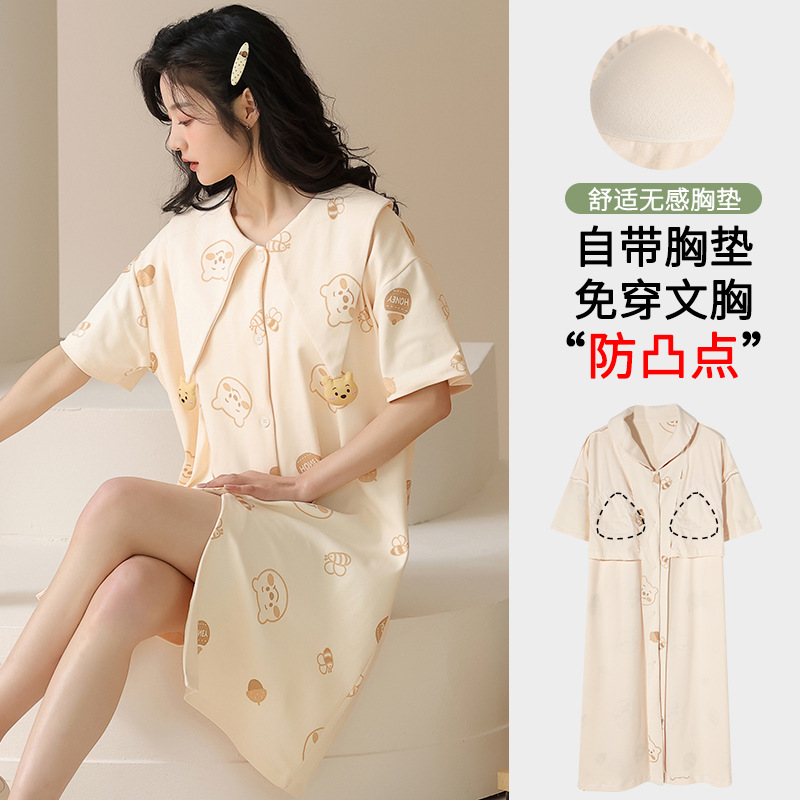 【带胸垫】夏季睡裙女纯棉短袖开衫中长款薄款睡衣夏天外穿家居服