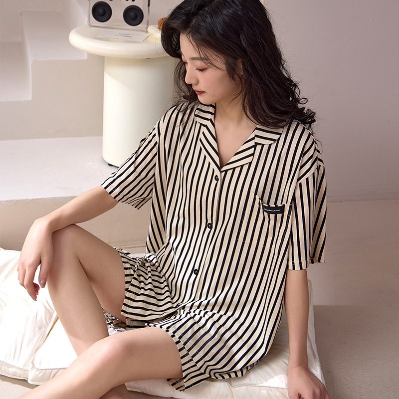 莫代尔睡衣女夏季新款短袖短裤开衫翻领女士薄款简约套装家居服夏