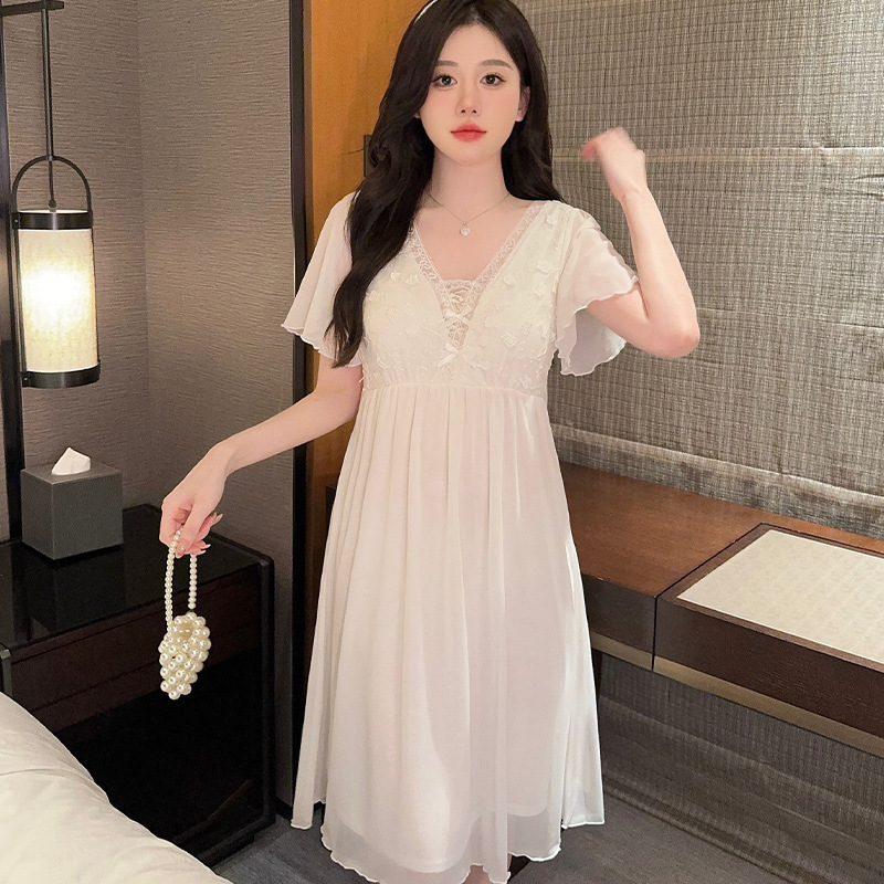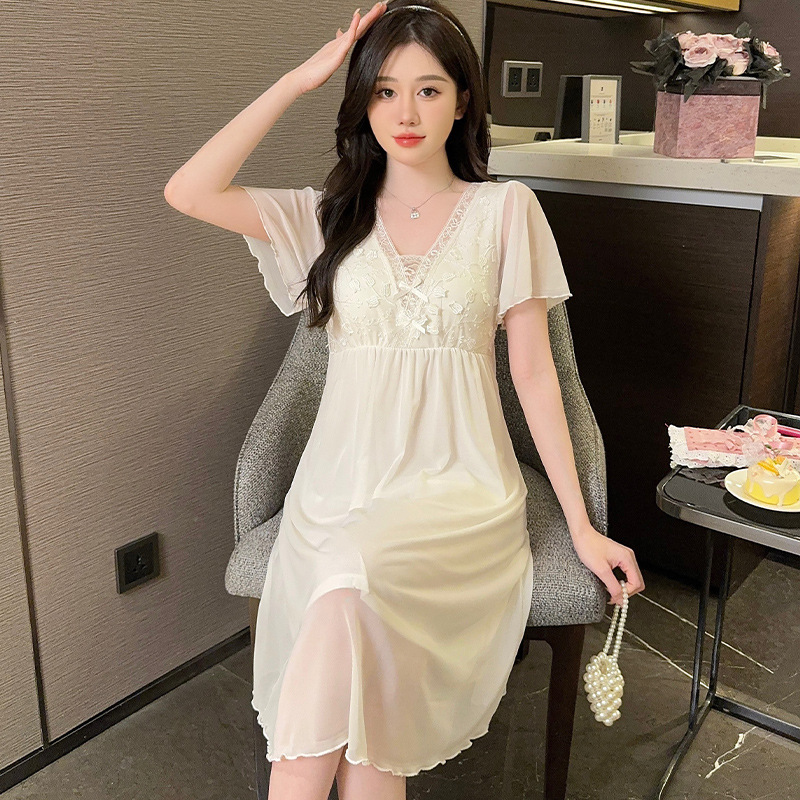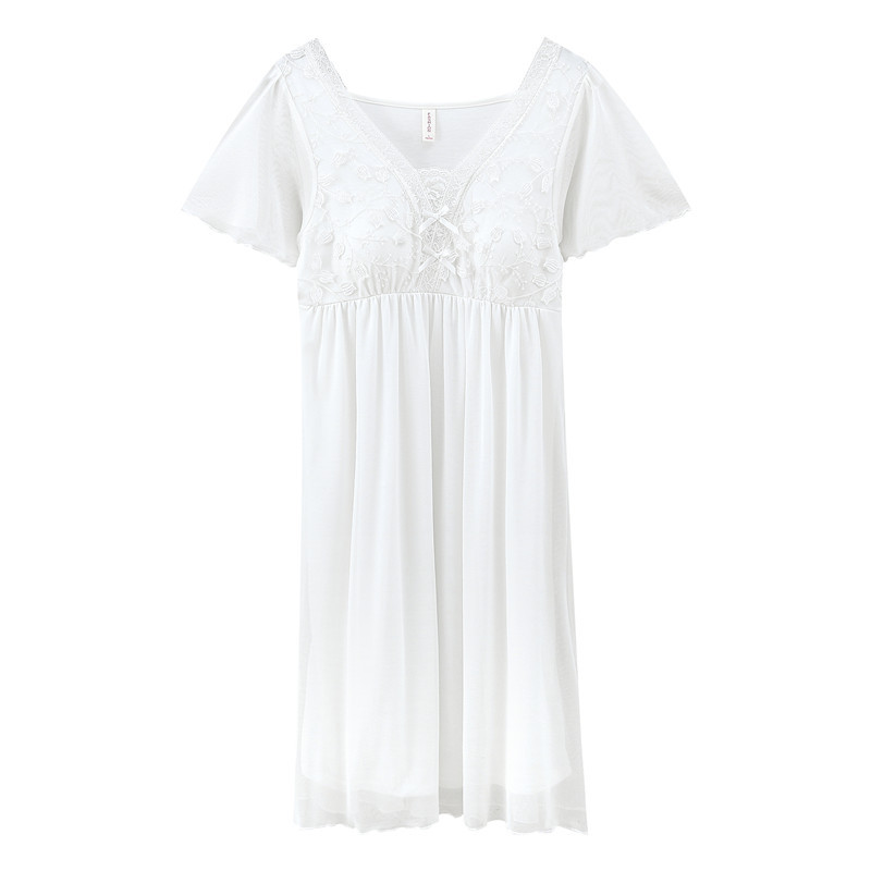 女士网纱蕾丝睡裙夏季薄款短袖莫代尔甜美仙女风带胸垫中裙家居服