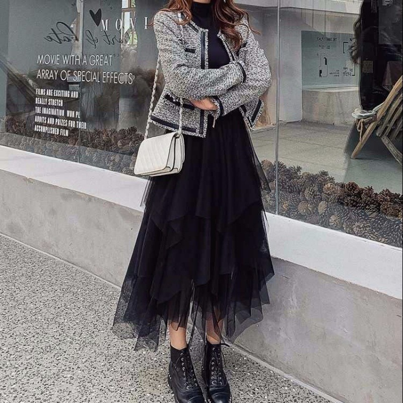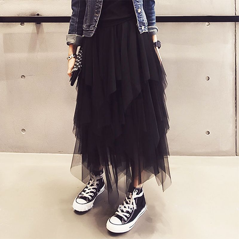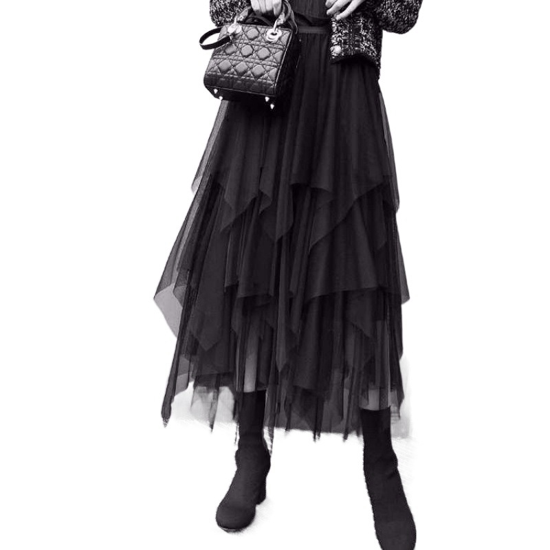 香港风网纱半身裙女不规则黑色高腰修身显瘦百搭中长款蓬蓬A字裙