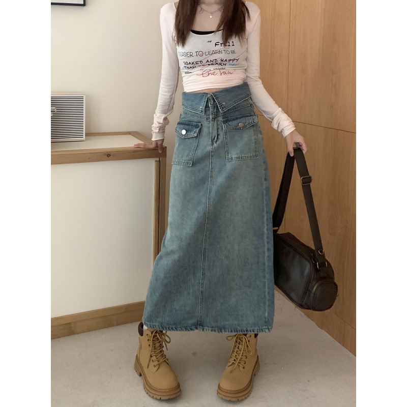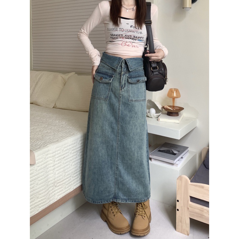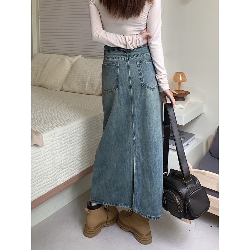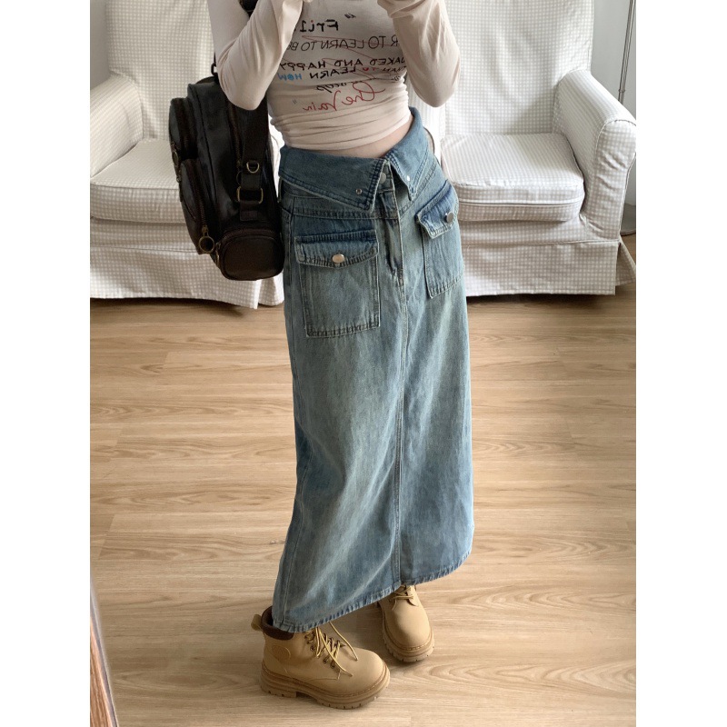 实拍复古开叉牛仔半身裙大码女春夏设计感高腰显瘦中长款a字裙