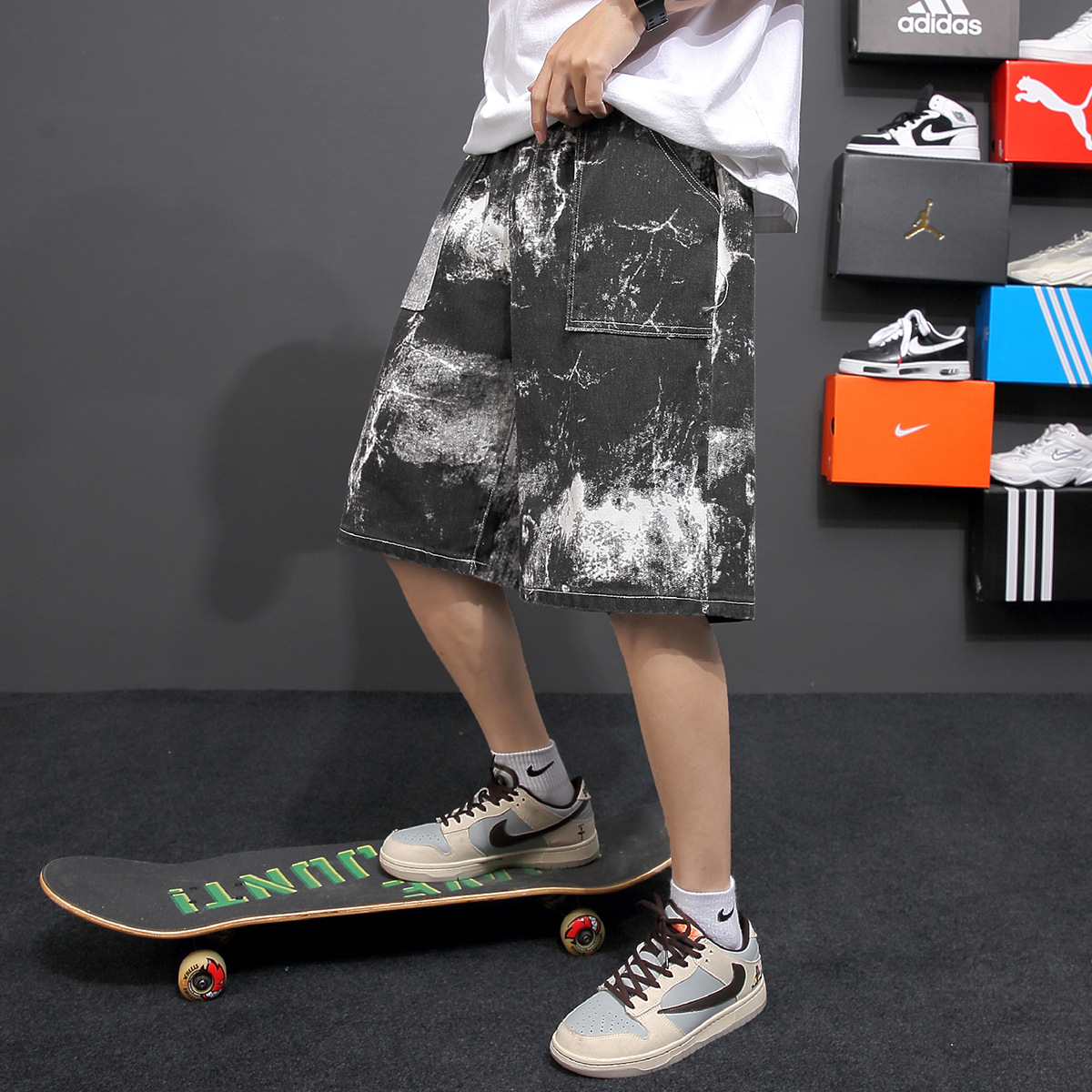 夏季抽身印花阔腿宽松提花男士五分牛仔裤直筒时尚休闲百搭