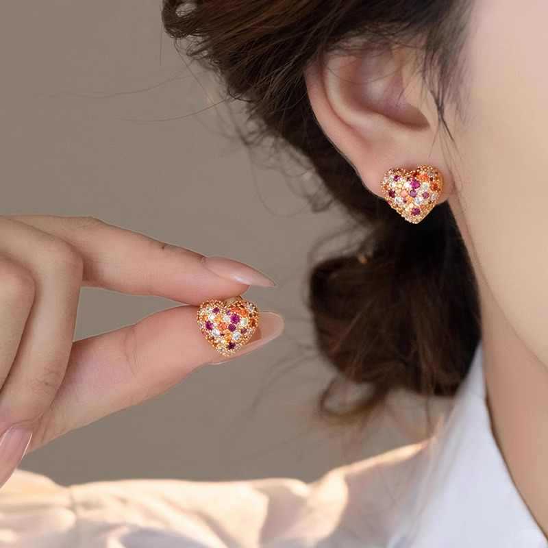 气质紫红色多彩爱心锆石耳钉女小巧精致时尚小众独特绝美银针耳环