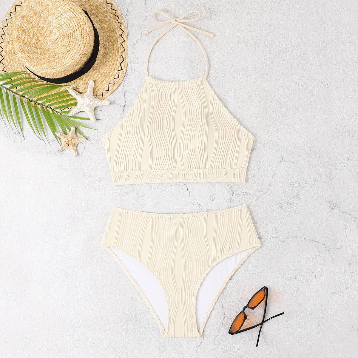 新款ins风欧美外贸泳衣女分体高腰亚马逊纯色网红比基尼