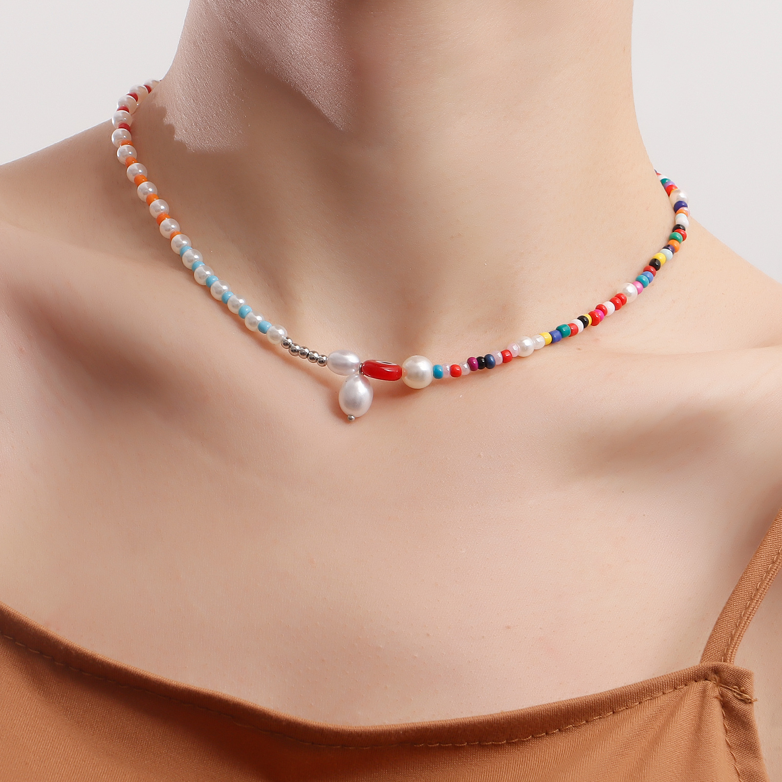 波西米亚七彩米珠恶魔之眼珍珠项链女 潮酷混搭项饰