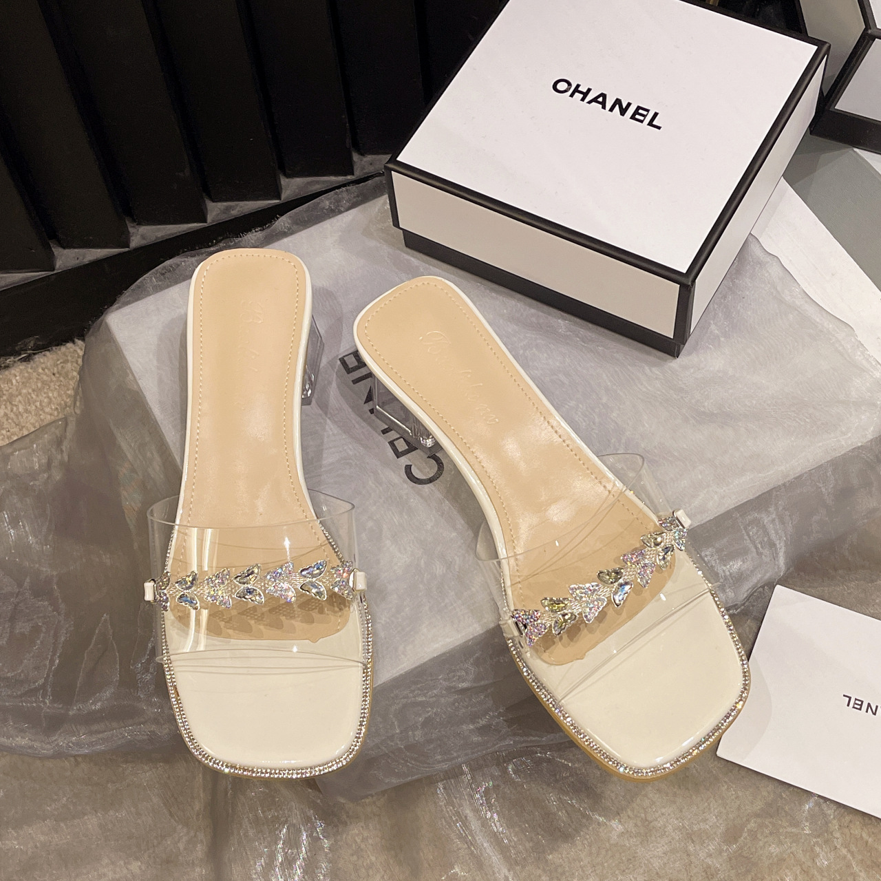 法式水钻透明水晶跟凉鞋女夏一字带高级感粗跟拖鞋高跟鞋外穿凉拖
