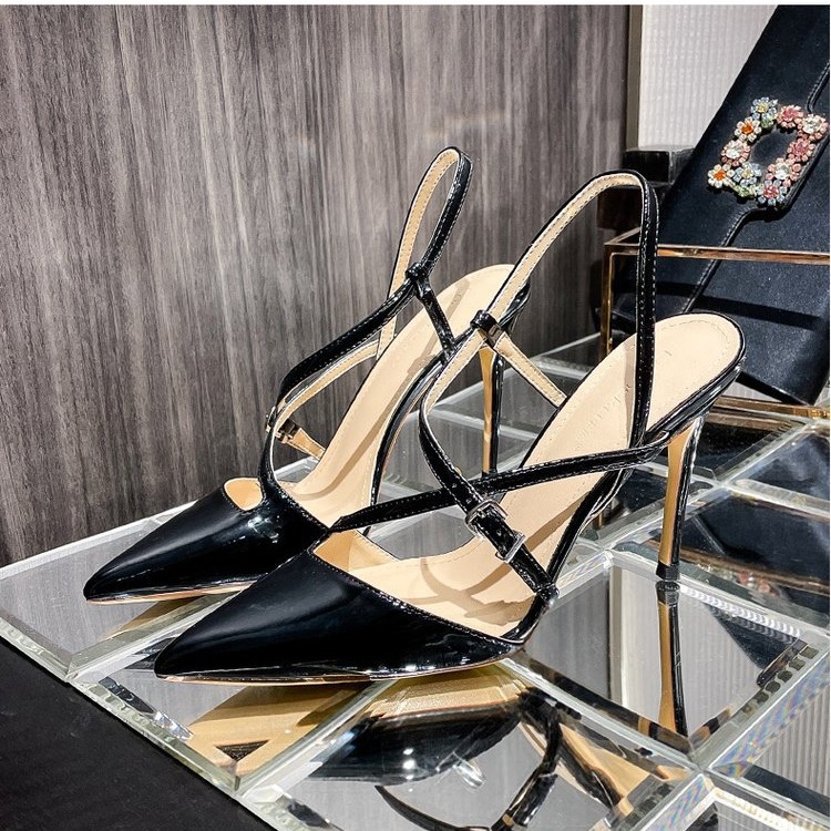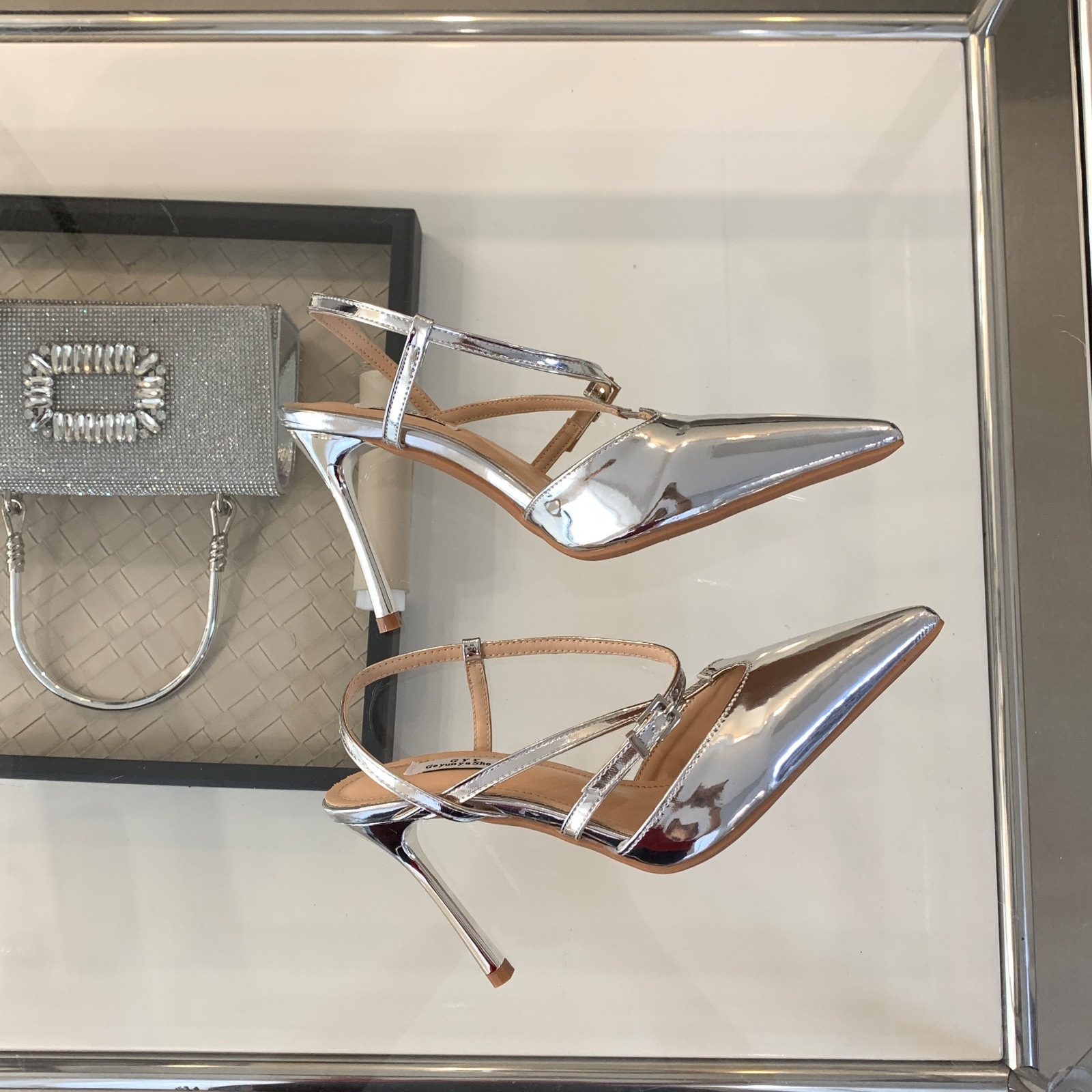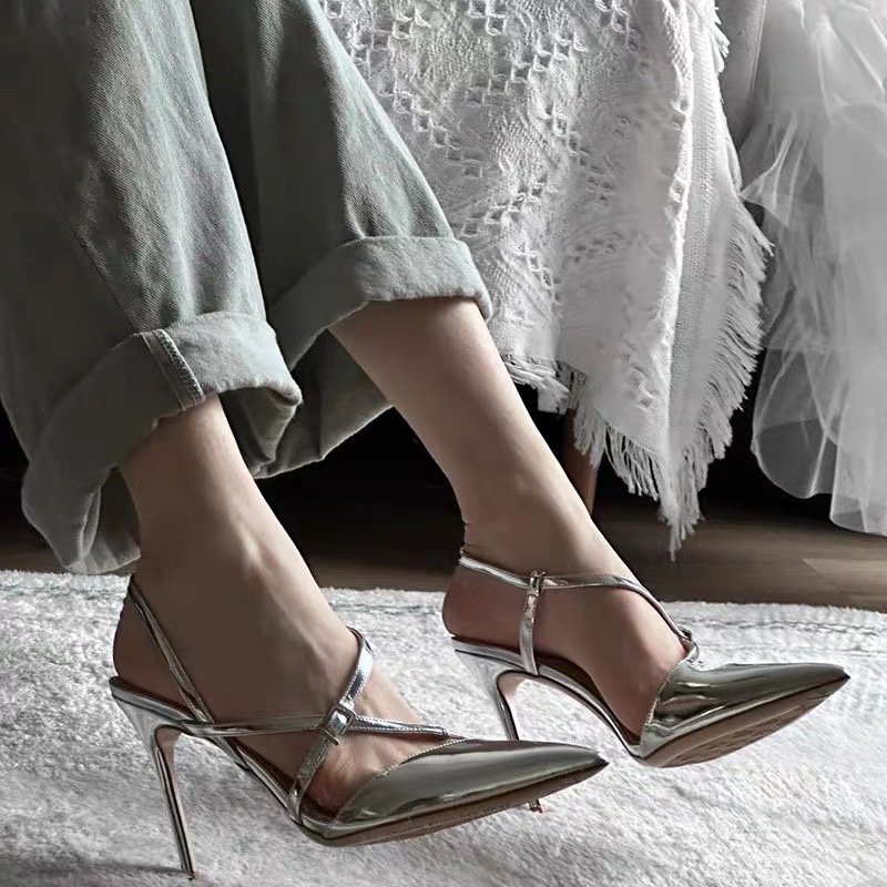 高级感!银色漆皮交叉一字扣带尖头细跟凉鞋女性感包头仙高跟单鞋