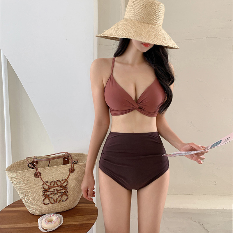 海边度假泳装纯色高腰时尚显瘦新款韩版分体泳衣