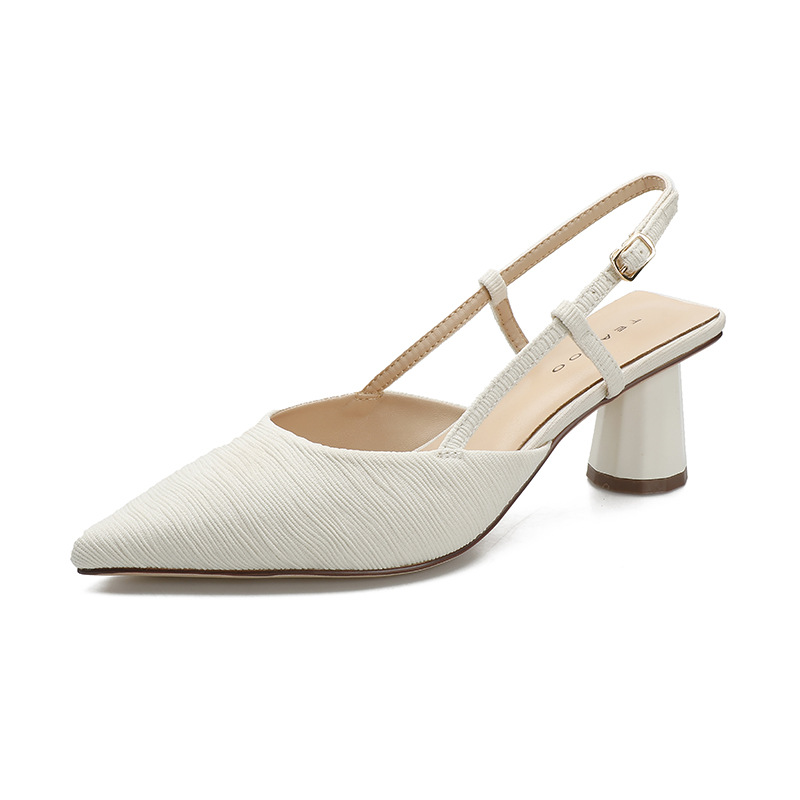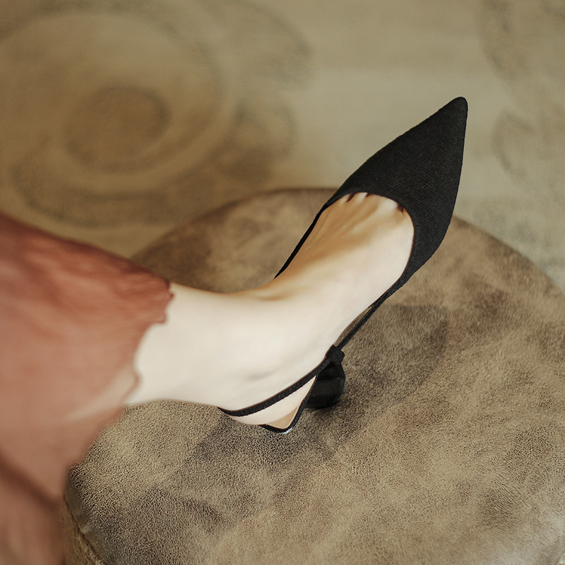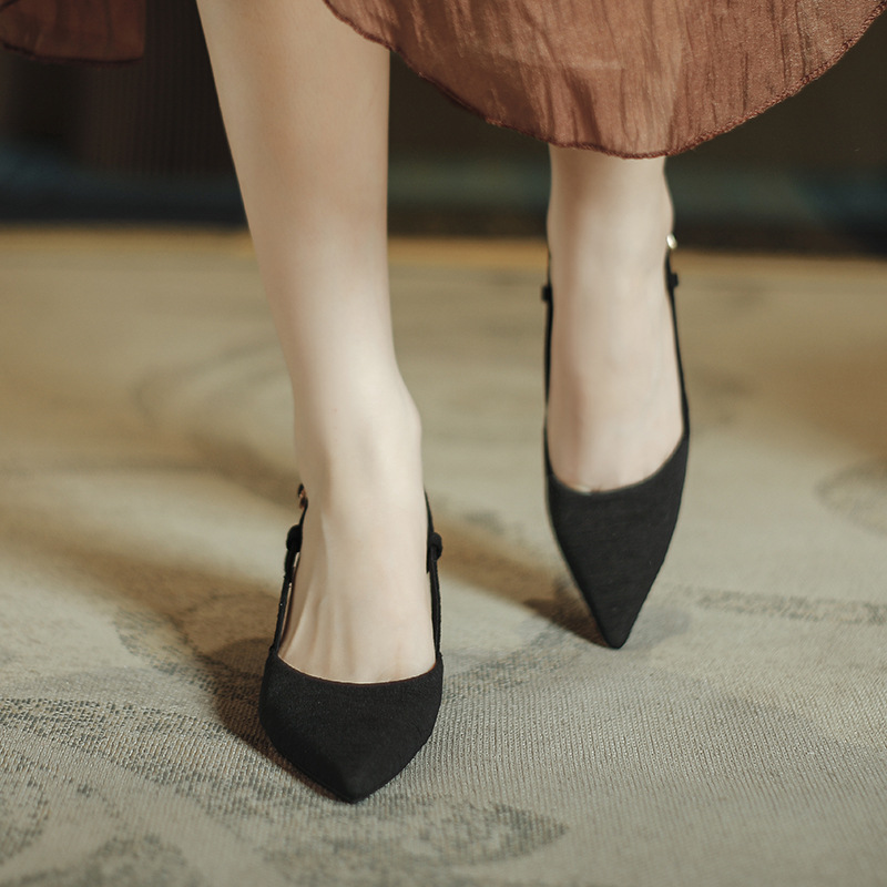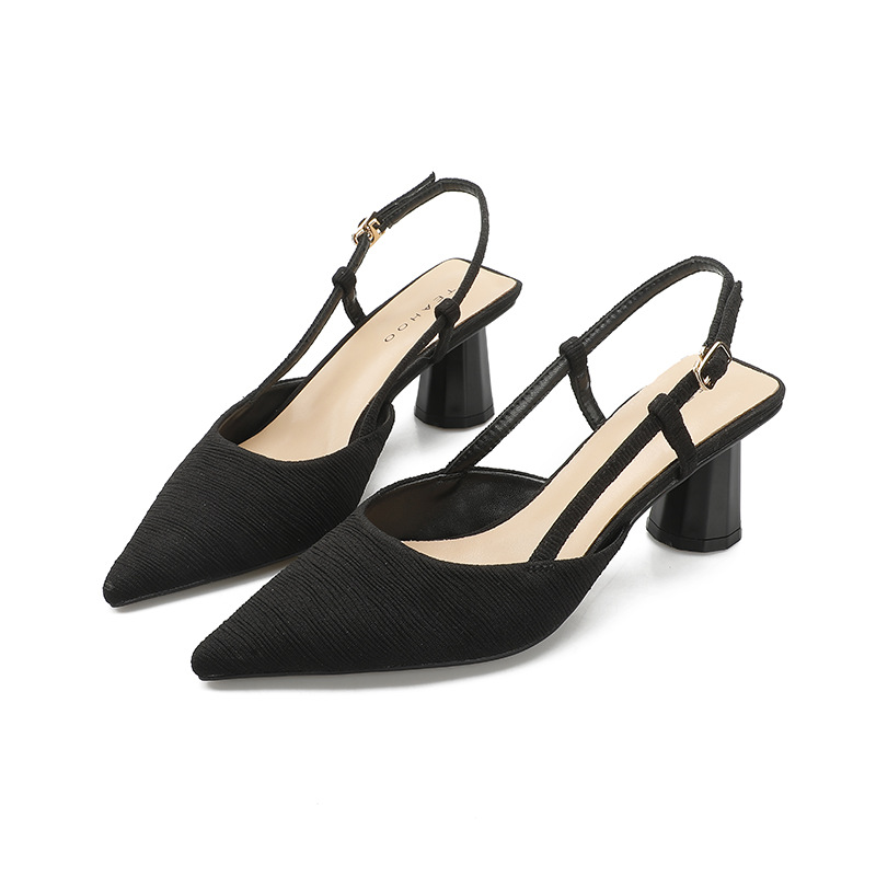 小香风女鞋夏新款法式少女尖头后空粗跟凉鞋绸缎高贵高跟女鞋
