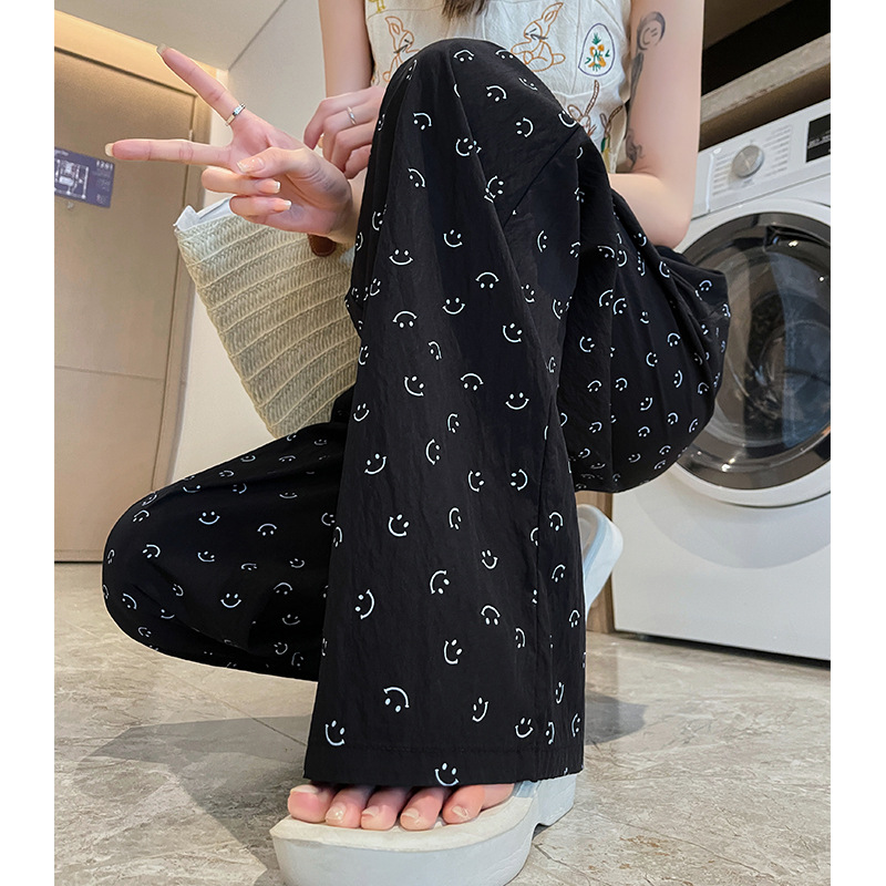 黑色笑脸印花山本阔腿裤女夏天薄款高腰垂感冰丝棉麻直筒拖地长裤