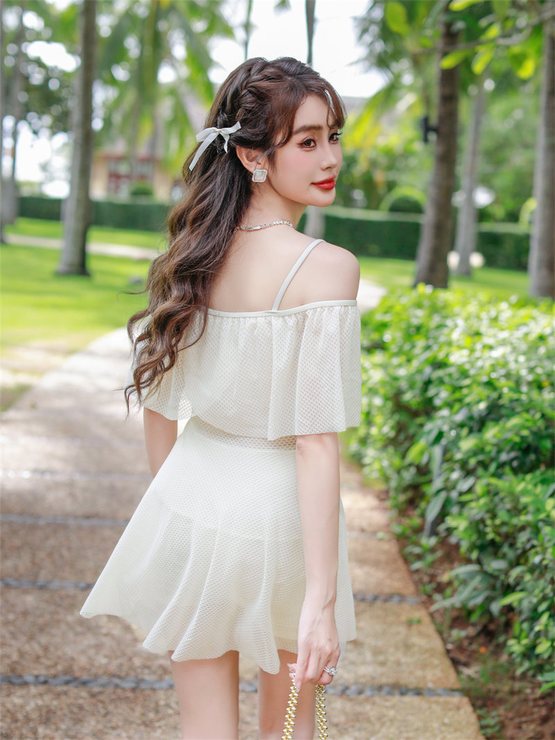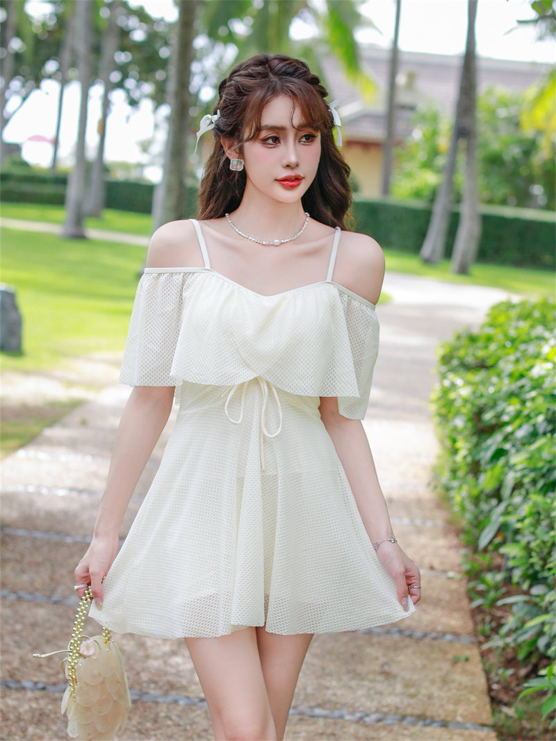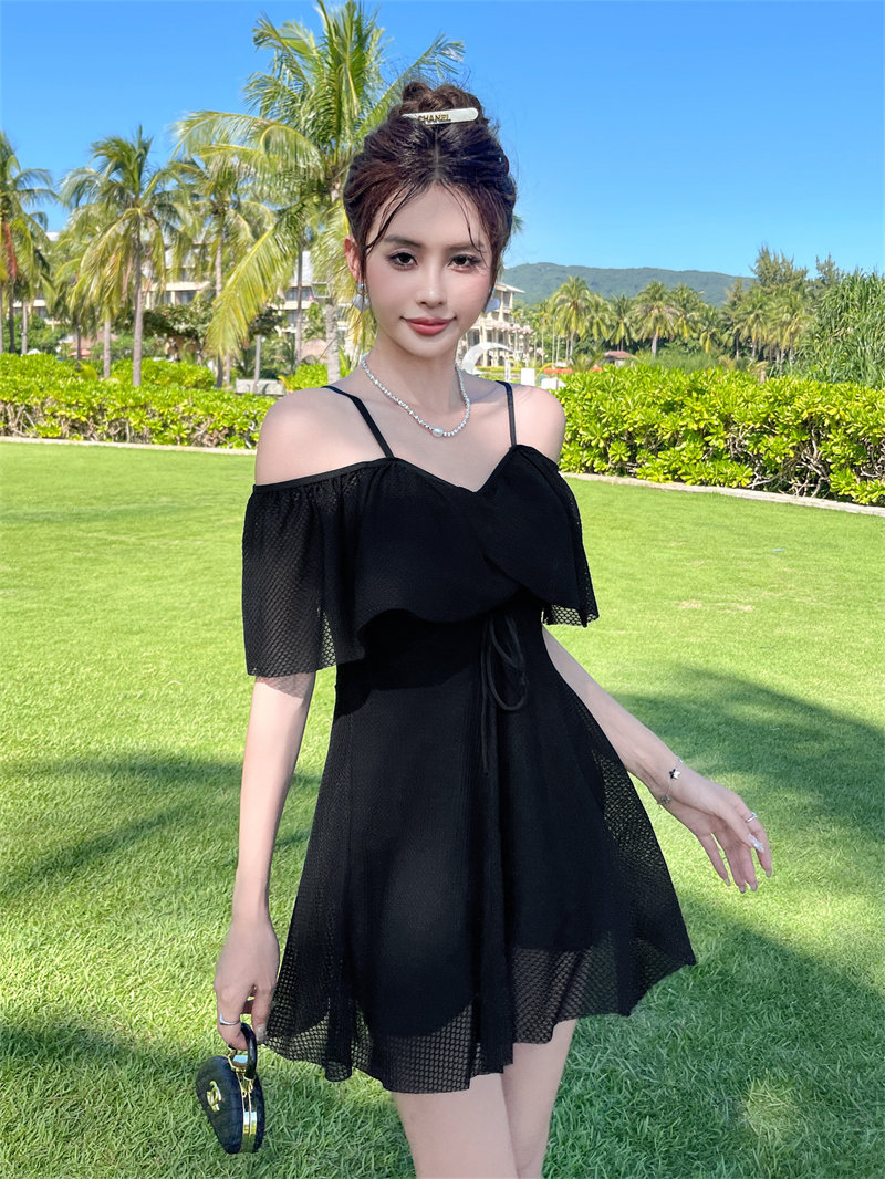 泳衣女士泡温泉性感露肩连体显瘦遮肚游泳衣素色泳装