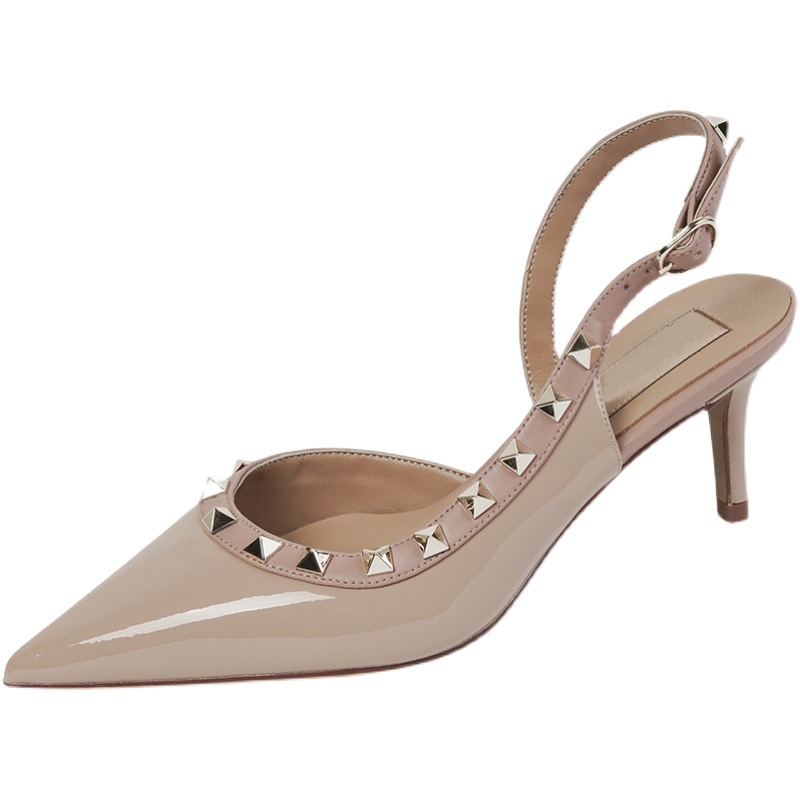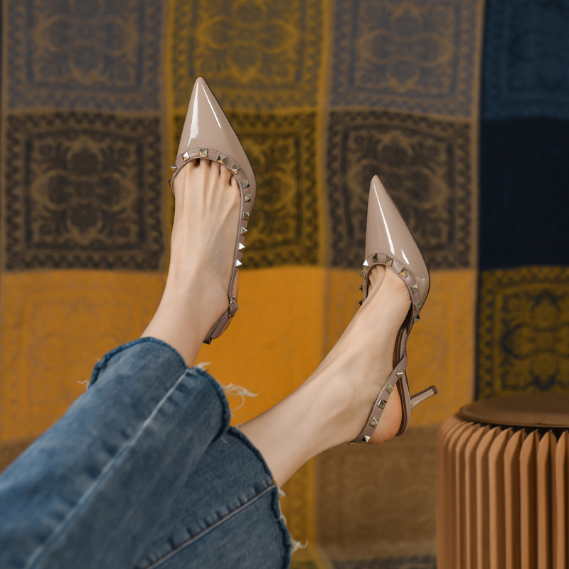 春夏性感铆钉凉鞋女包头裸色漆皮高跟鞋尖头细跟浅口真皮百搭女鞋