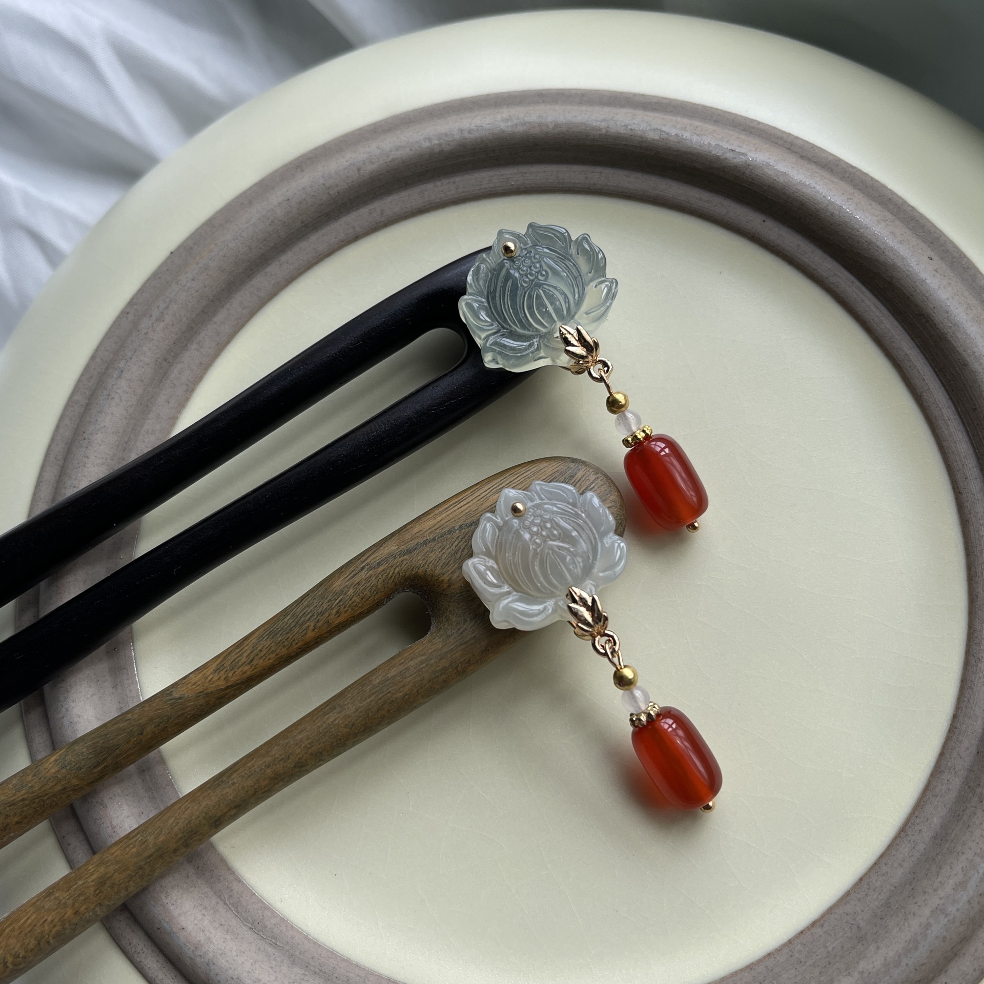 【不负韶华】绿檀木发簪短款U型日常盘发简约发钗岫玉莲花流苏女