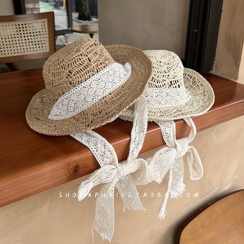 韩国ins婴幼儿童蕾丝绑带草帽夏季女宝宝防晒遮阳公主出游沙滩帽