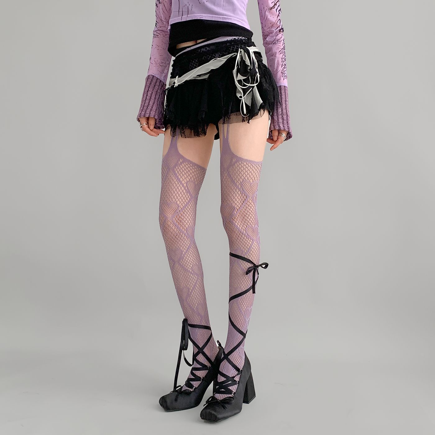 夏季新品长筒网袜过膝一体式吊带袜子女春秋白色蕾丝提花爱心丝袜