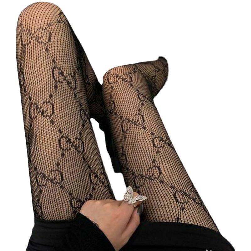 双g字母丝袜女爆款春秋网红ins渔网袜黑色连裤网格镂空打底袜