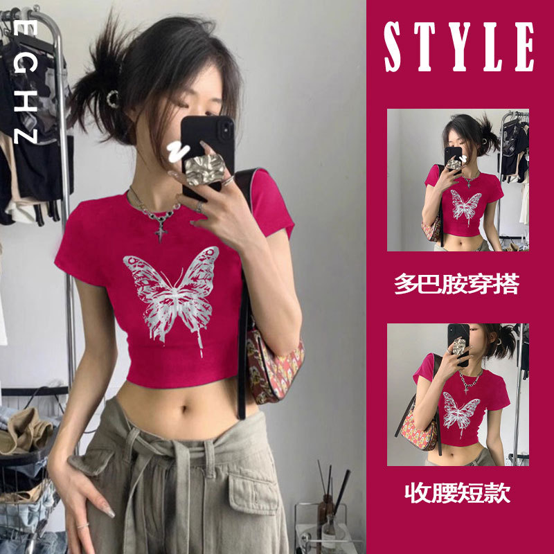 收腰女新款早春短款甜酷辣妹风短袖t恤【32支纯棉螺纹面料】