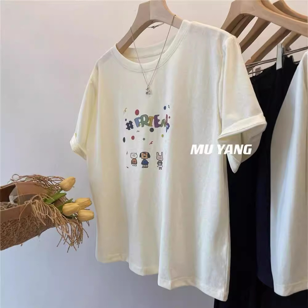 超手感莫代尔彩色音符字母印花百搭休闲小众短袖T恤半截袖上衣女