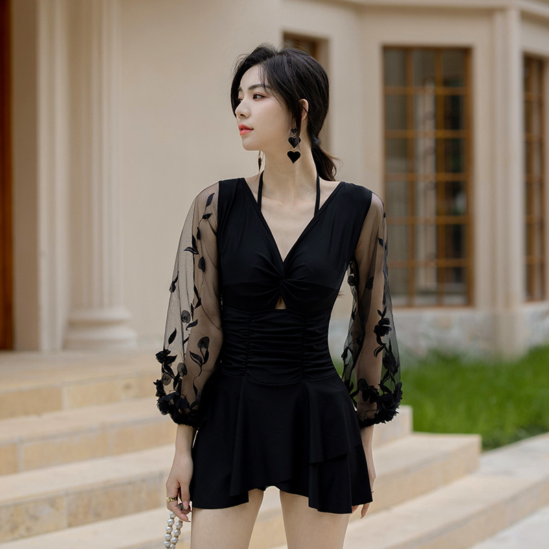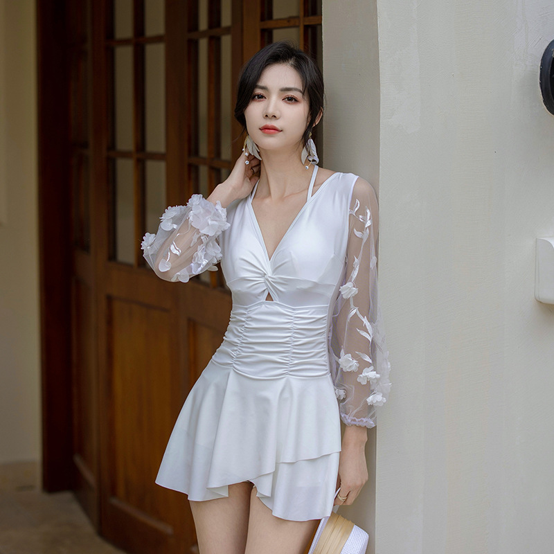连体泳衣女冬季新款韩版泡温泉泳装连体裙式平角保守游泳衣女