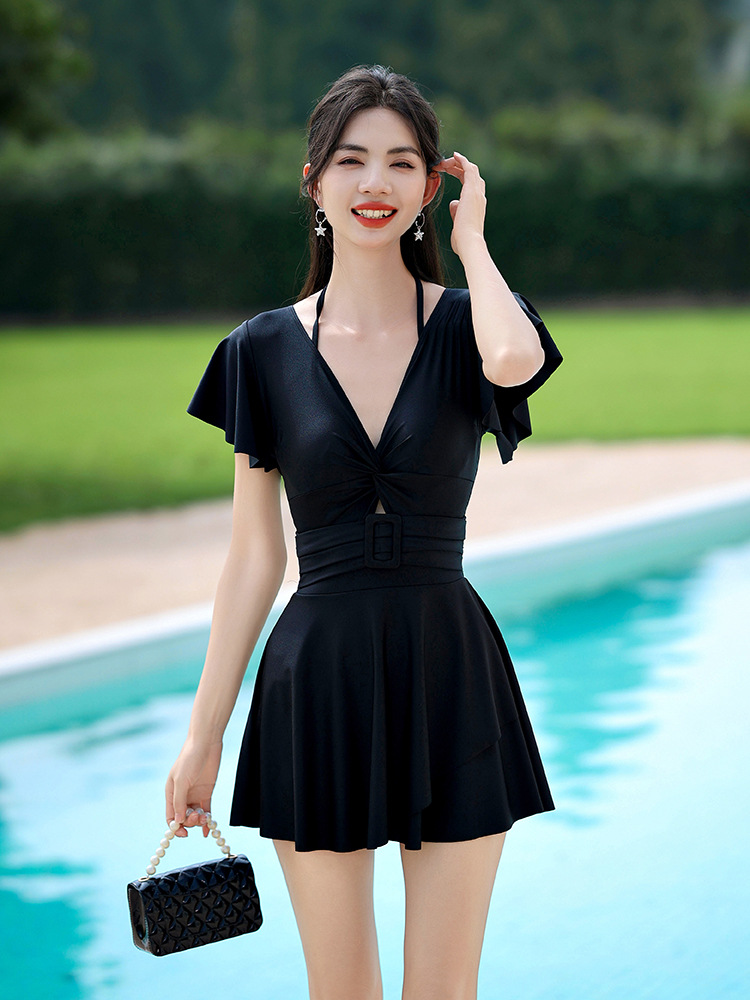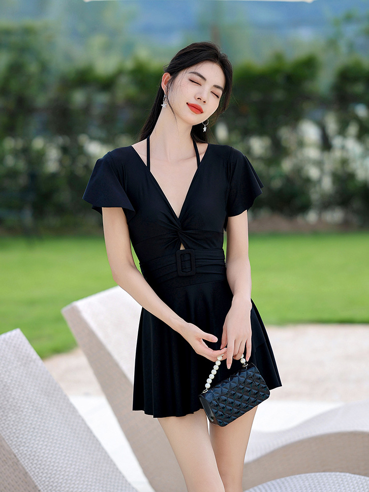 高腰V领连体泳衣女新款韩国露背显瘦平角保守裙式温泉游泳装