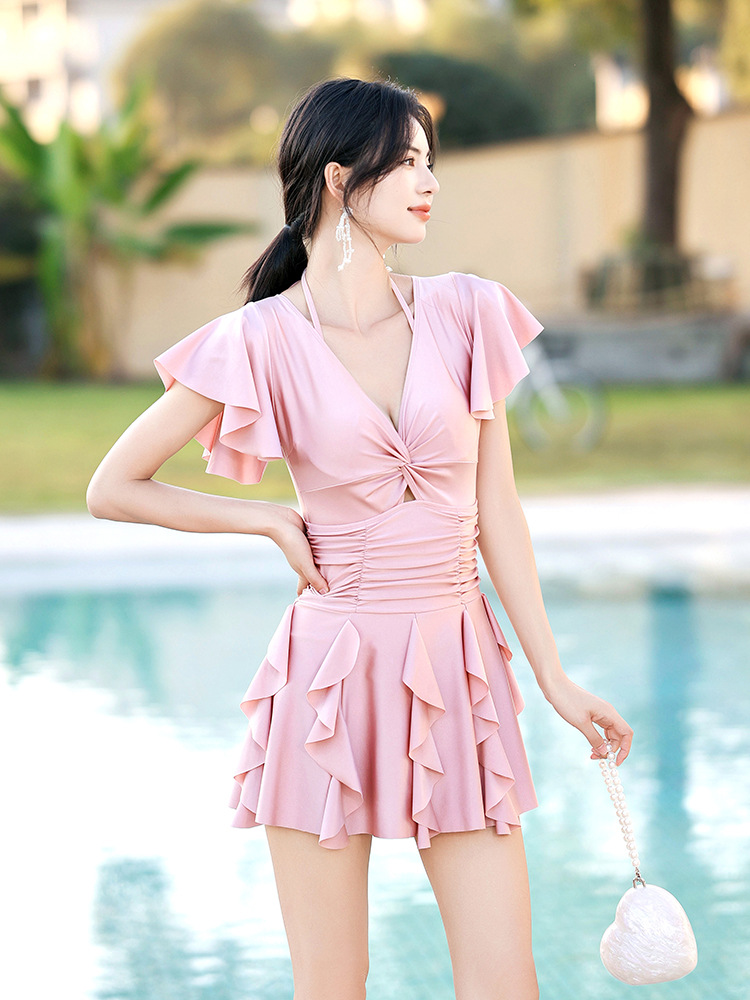 新款韩国连体泳衣女款保守纯色小清新遮肚显瘦裙式泡温泉泳装