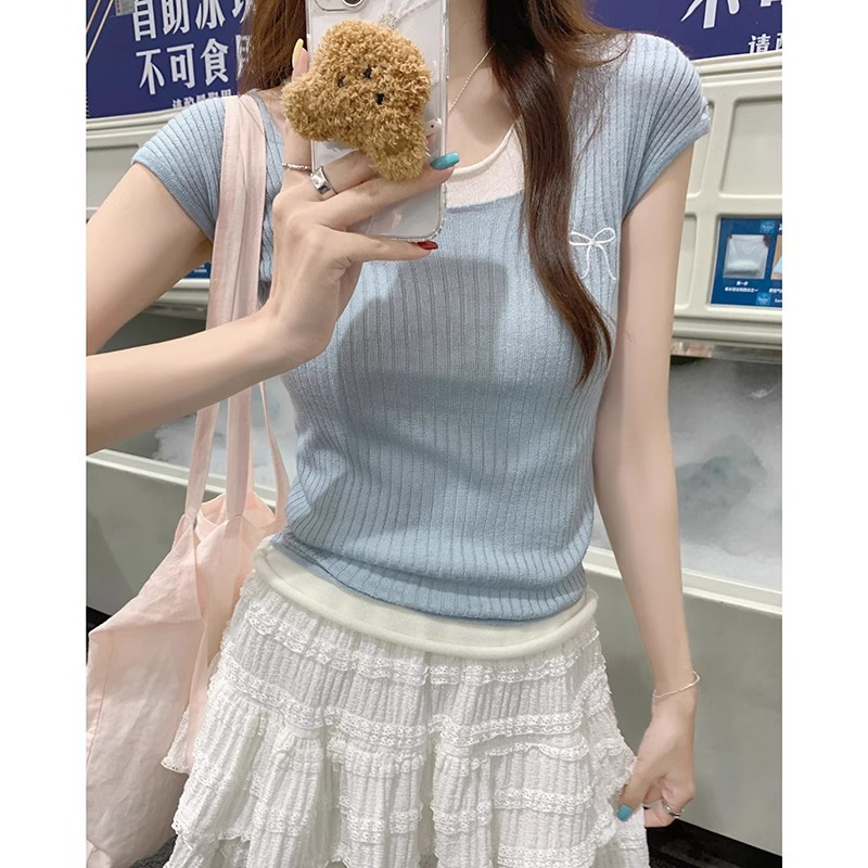 蝴蝶结刺绣短袖t恤女夏季新款修身显瘦拼色坎肩圆领别致上衣