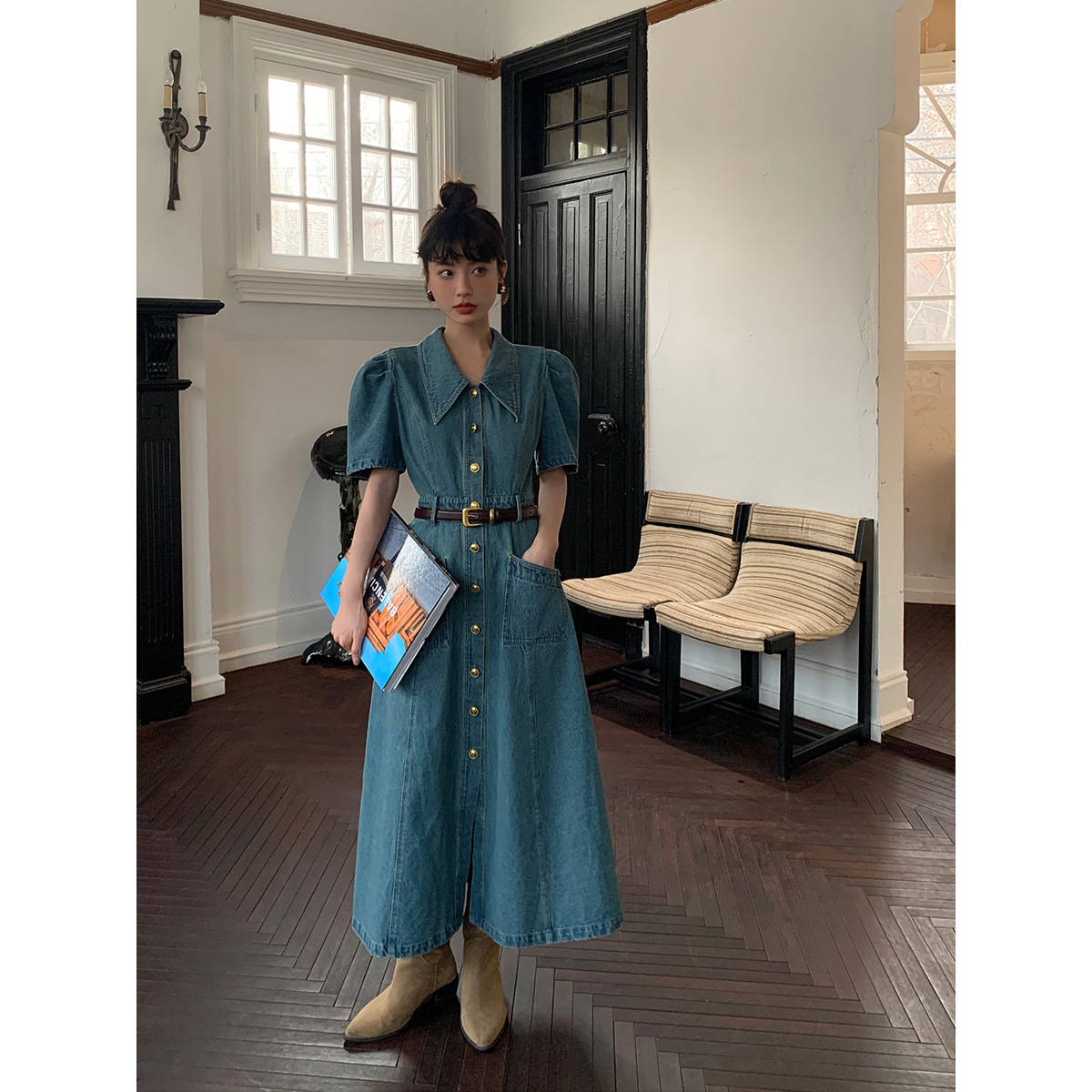 诠释美NEW OPEN夏复古牛仔连衣裙女配腰带收腰气质长裙82201