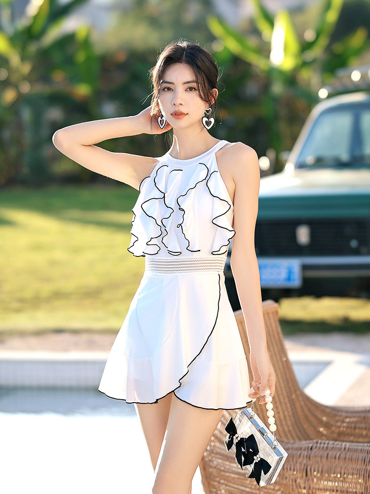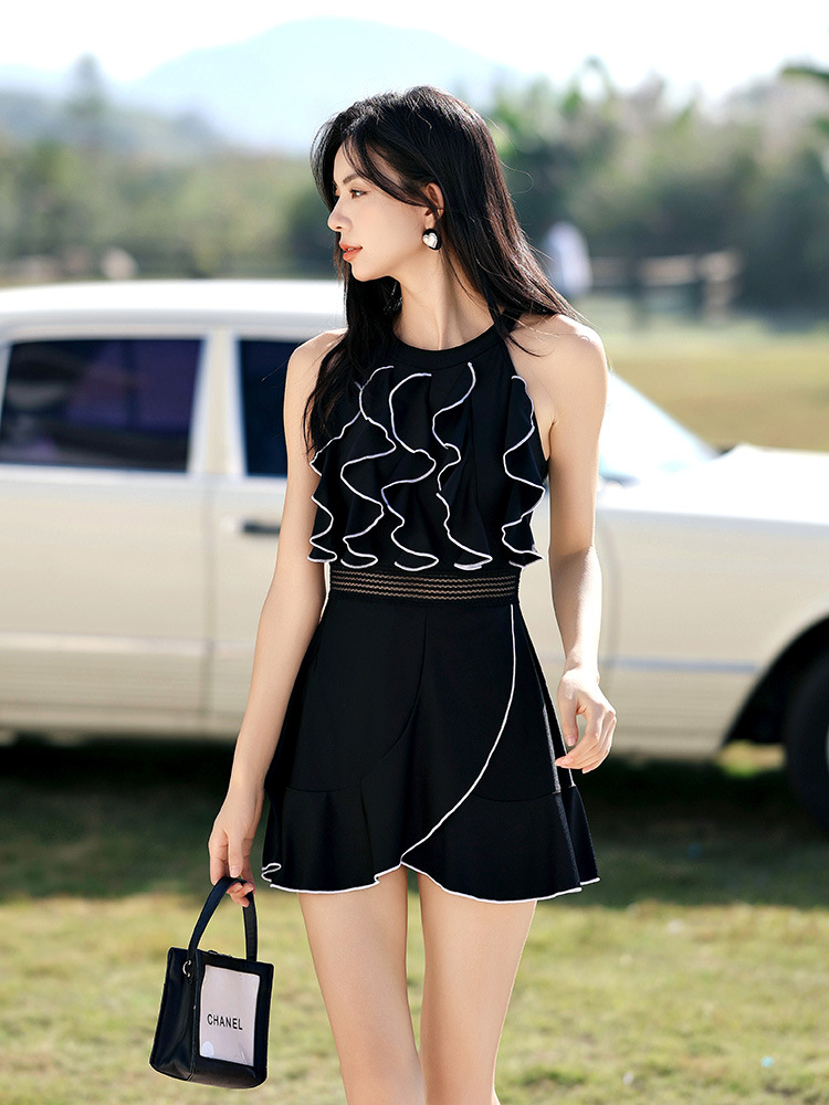 温泉泳衣女连体裙式新款连体保守遮肚显瘦平角泳装学生游泳衣