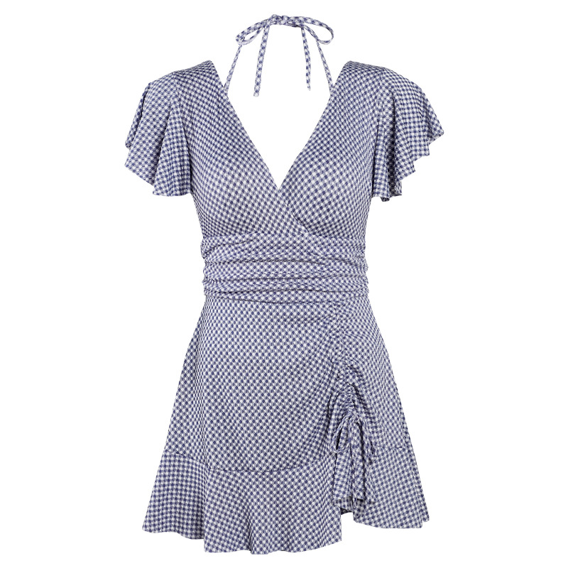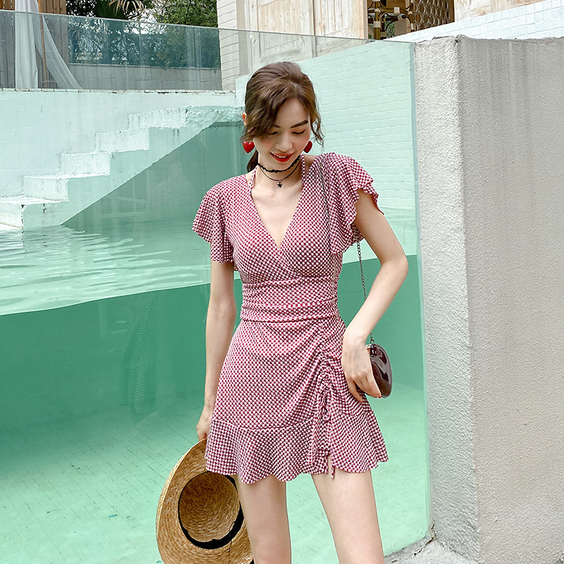 新款连体泳衣女韩版时尚细格纹小胸钢托聚拢游泳衣女温泉泳装