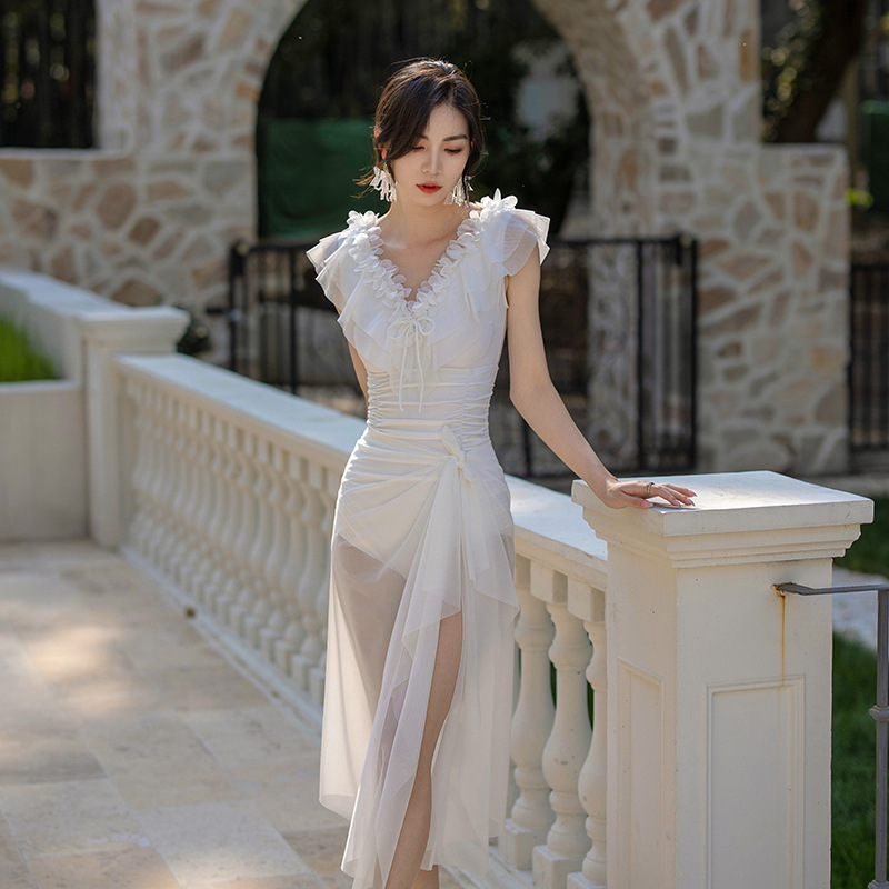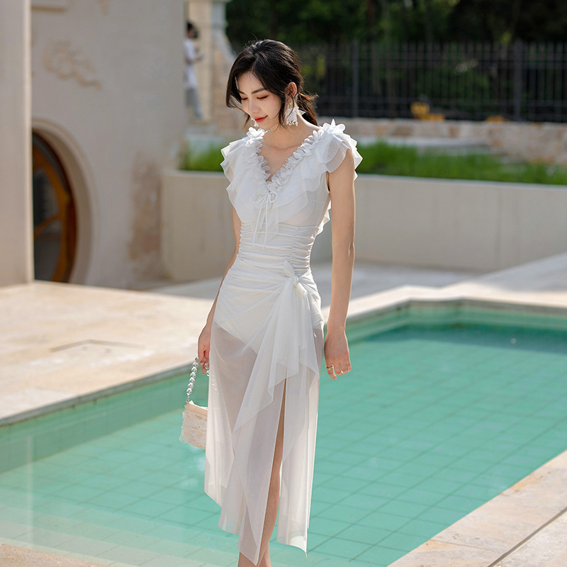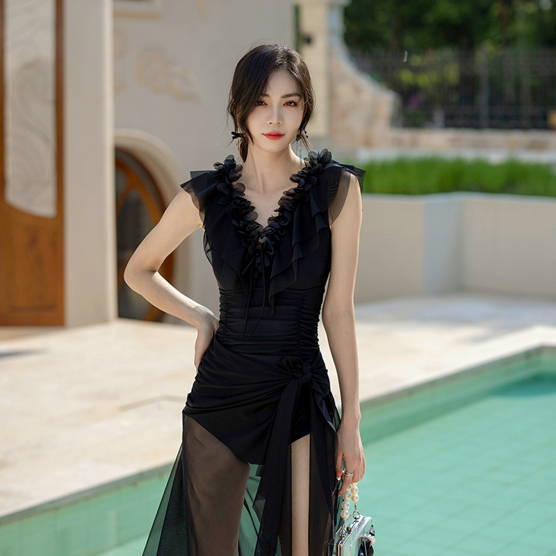 汐歌儿蕾丝木耳边连体泳衣女新款高腰遮肚显瘦泳衣披纱两件套