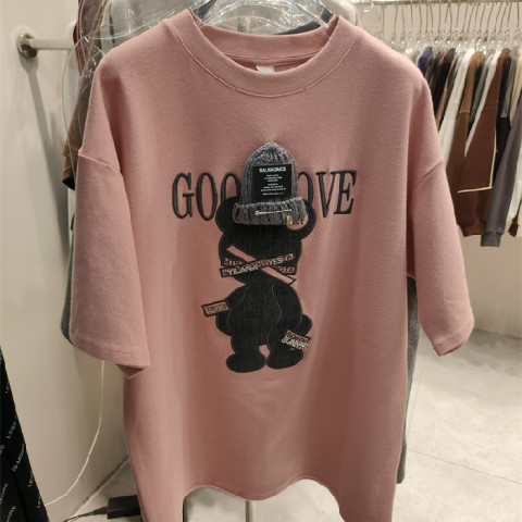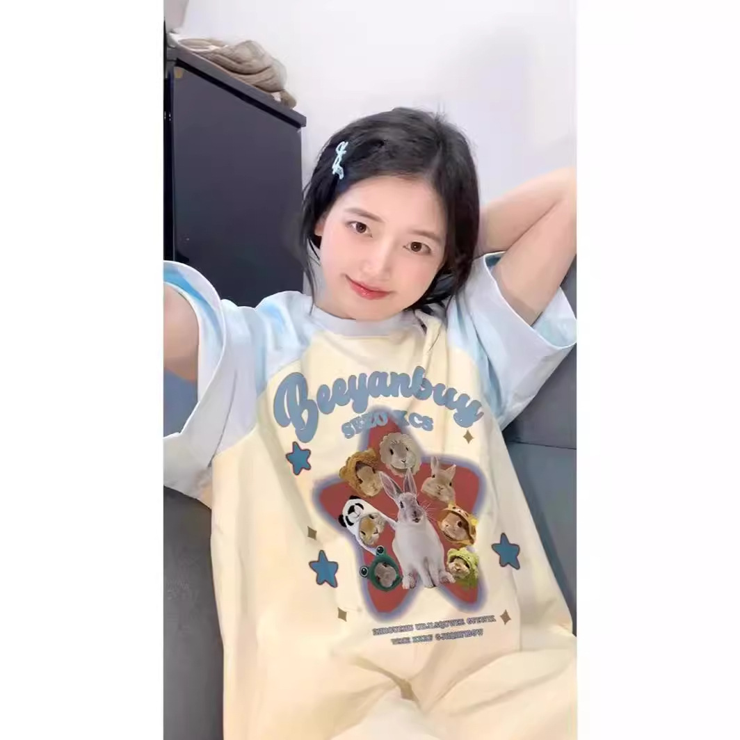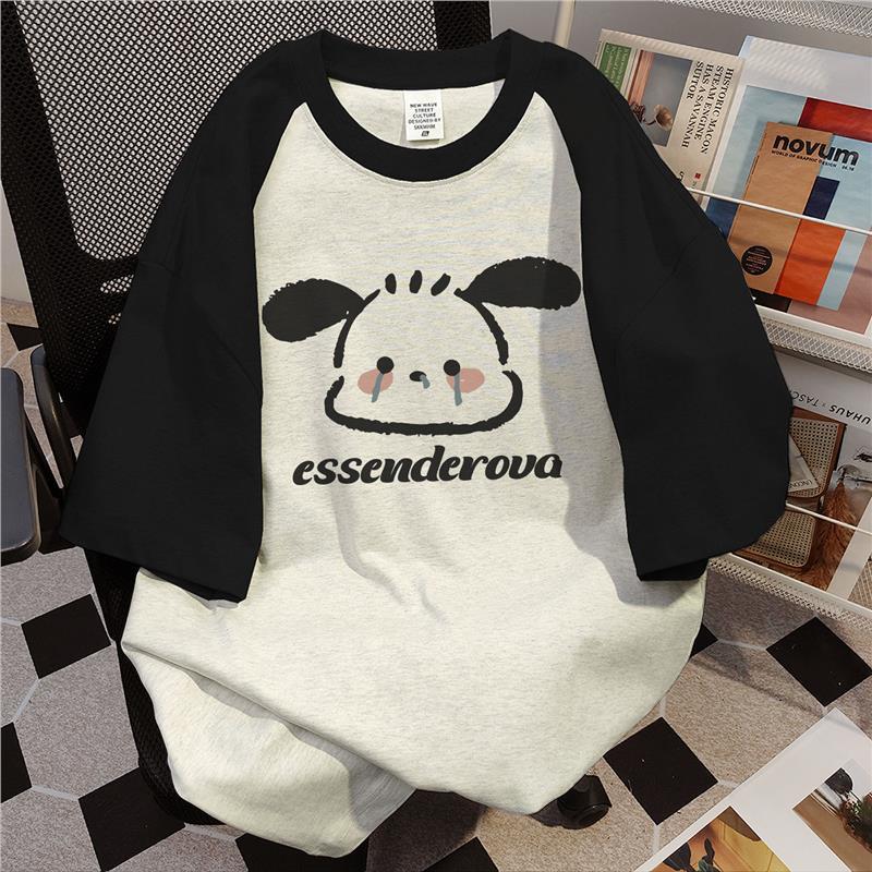 胖mm大码纯棉美式短袖上衣女夏宽松可爱小狗印花拼接圆领300斤t恤