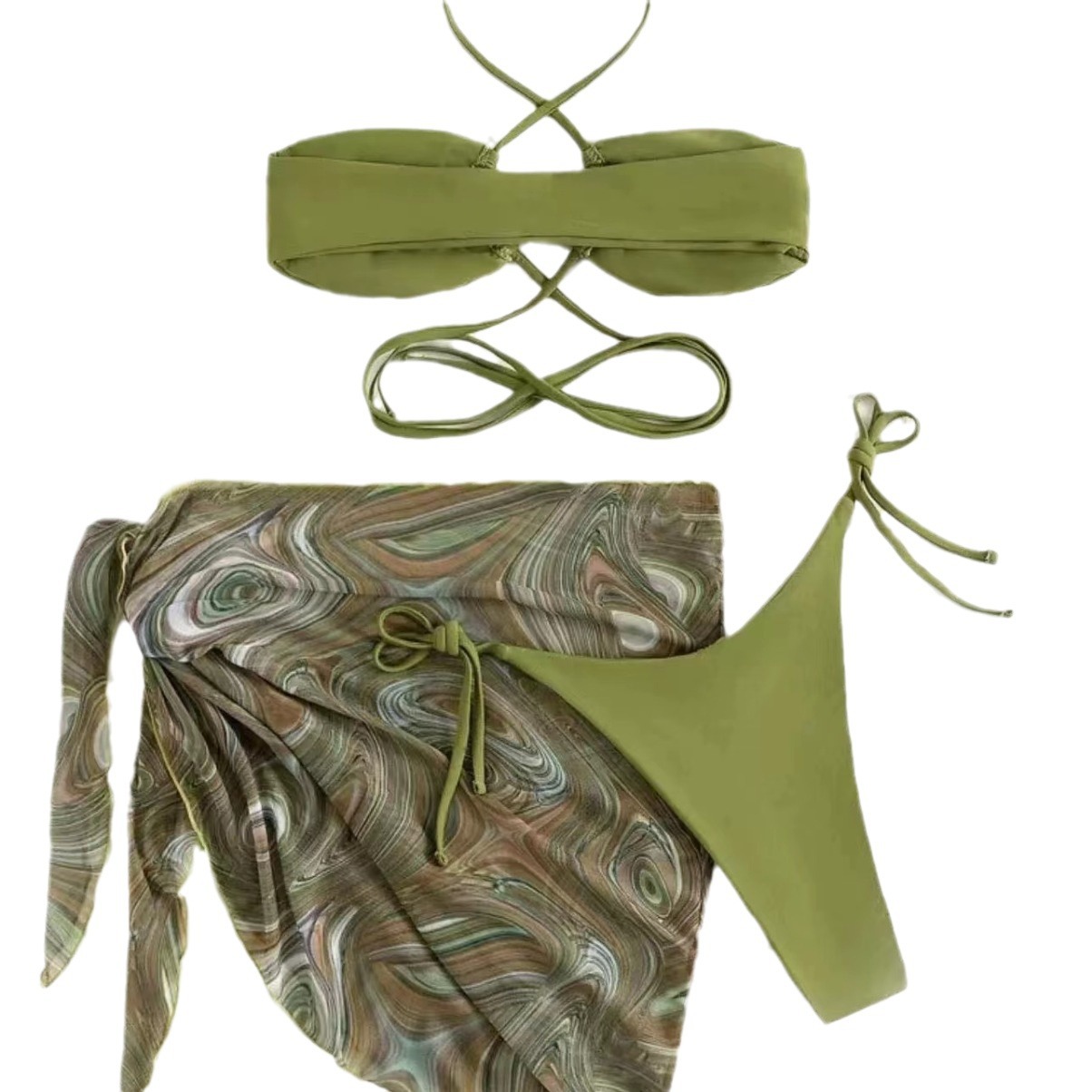 款欧美泳装时尚女比基尼网纱三件套抽绳绑带bikini性感镂空