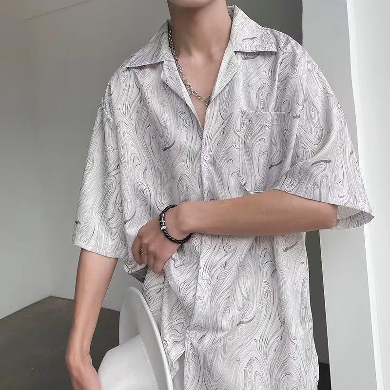 古巴领高级设计感小众vintage短袖花衬衫男夏季复古宽松沙滩衬衣