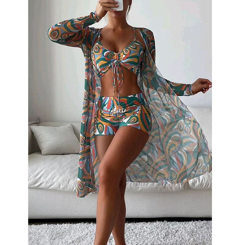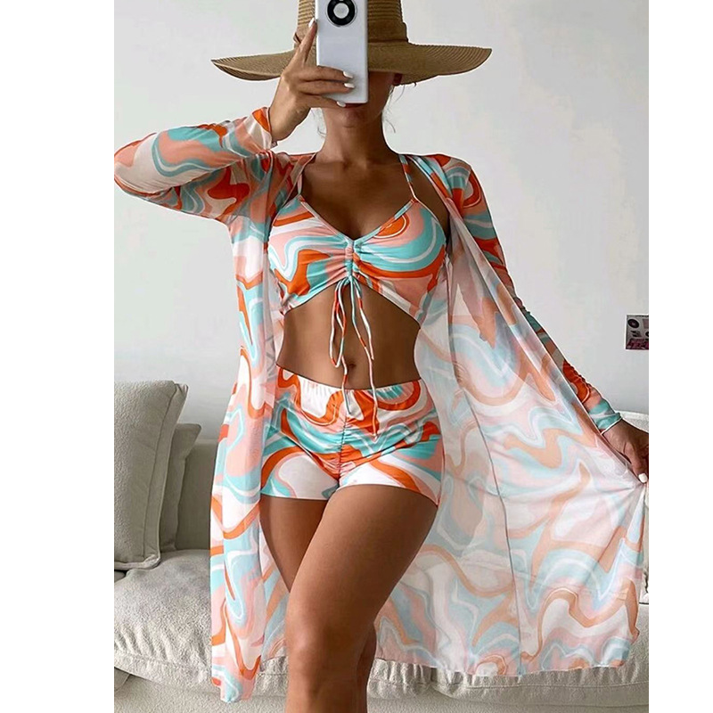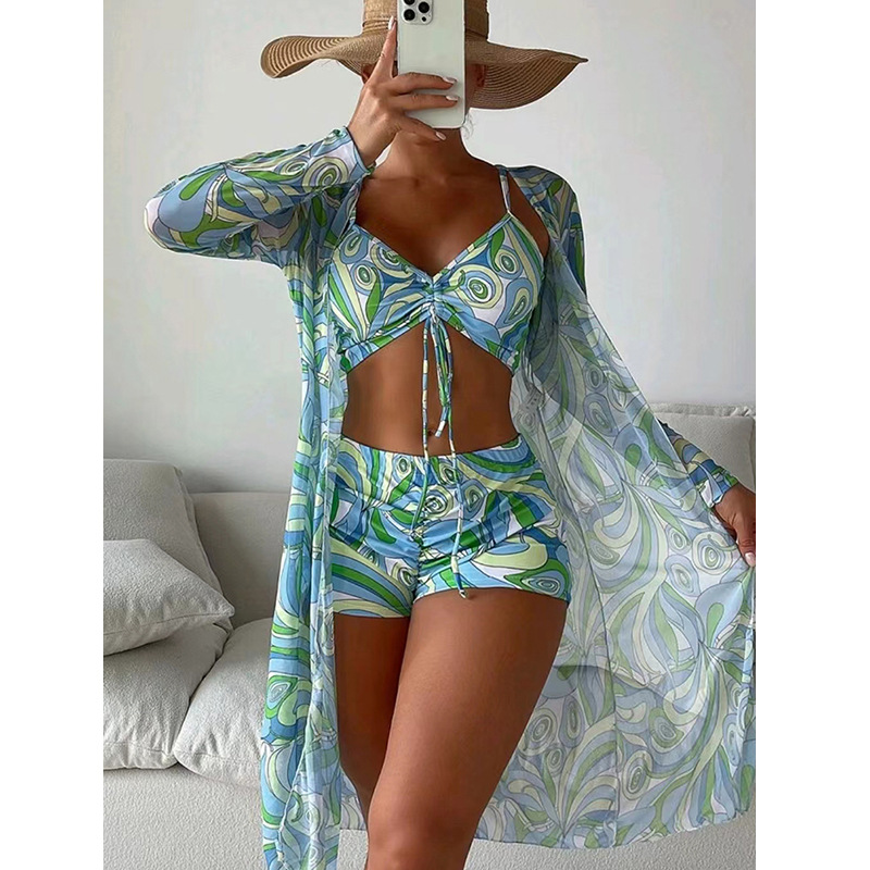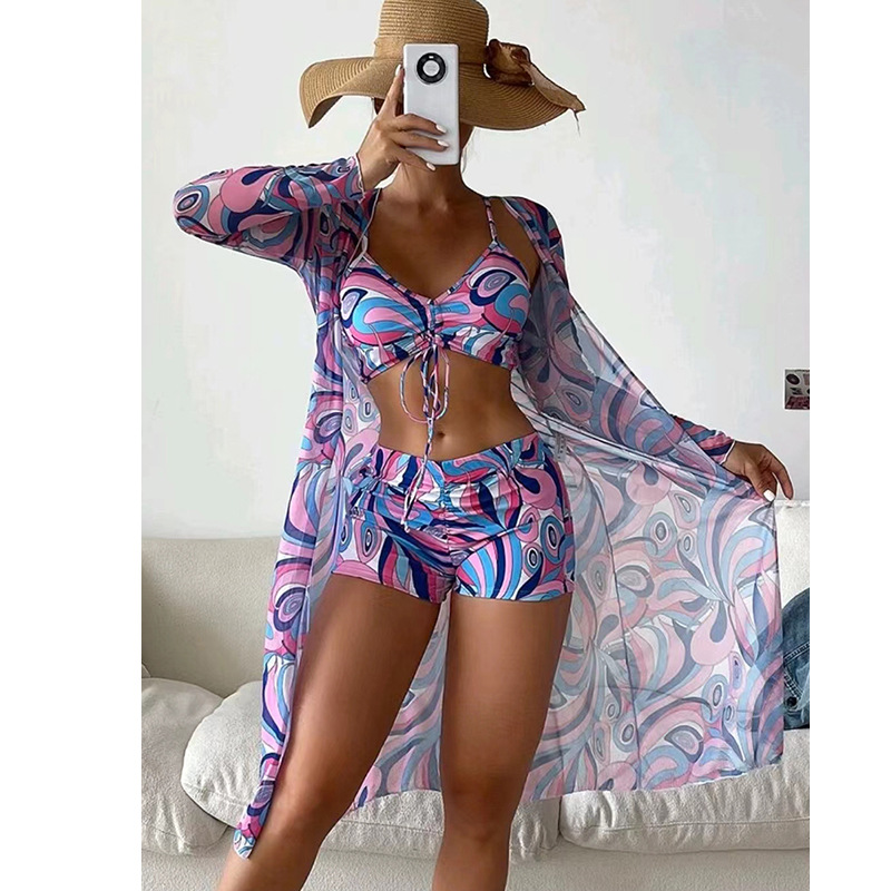 【欧美三件套泳衣女】分体胸部抽绳高腰平角裤数码印花长罩衫泳装