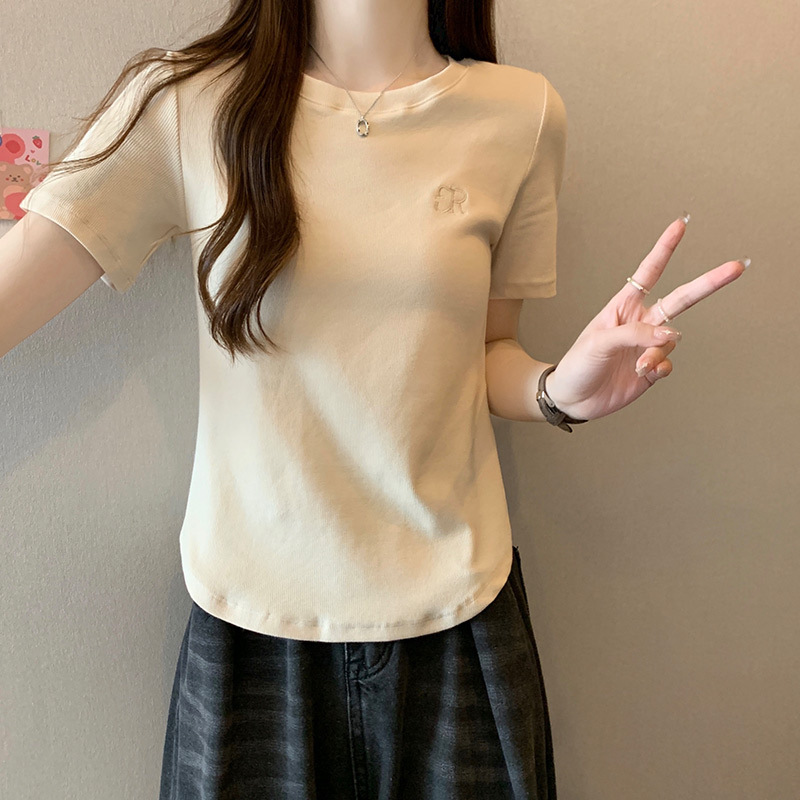 刺绣短袖t恤女正肩新款设计感夏装小众修身欧货上衣