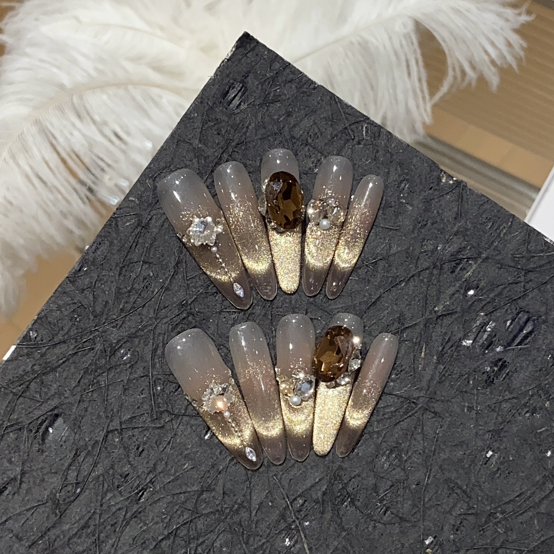 一只顾美甲 秋冬美拉德爆闪贵气微笑法式宽光猫眼碎钻摩洛哥指甲
