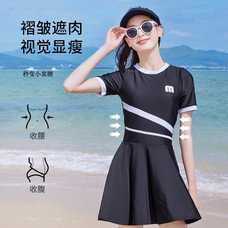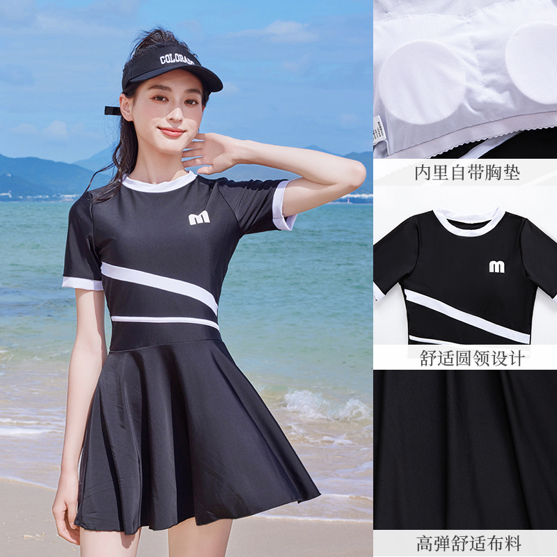 温泉泳衣女款连体裙式内搭底裤保守女运动泳衣个性字母印花大码装