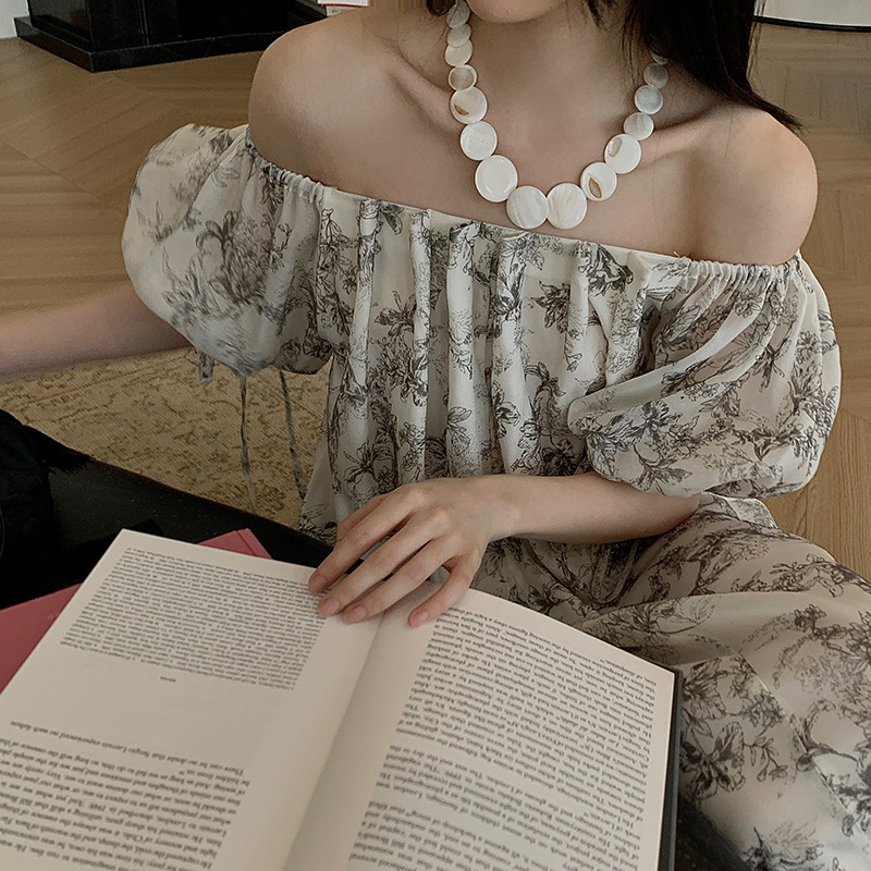 诠释美 NEW OPEN韩系碎花连衣裙女夏季水墨画一字肩长裙82673