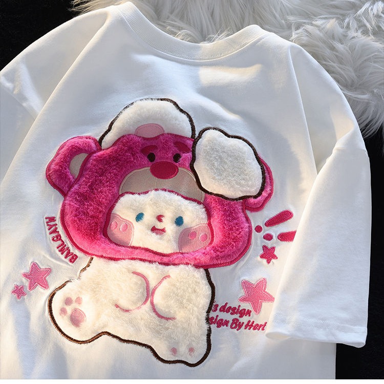 小熊帽子兔子纯棉短袖t恤女夏季新款宽松设计感小众情侣上衣潮牌