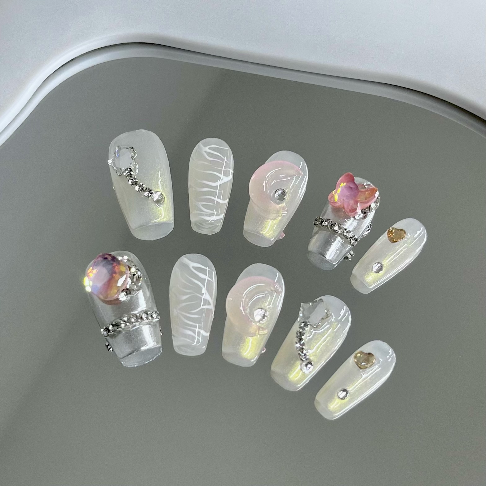 纯手工穿戴甲白月光立体蝴蝶饰品简约感新中式光疗甲片新娘甲婚甲