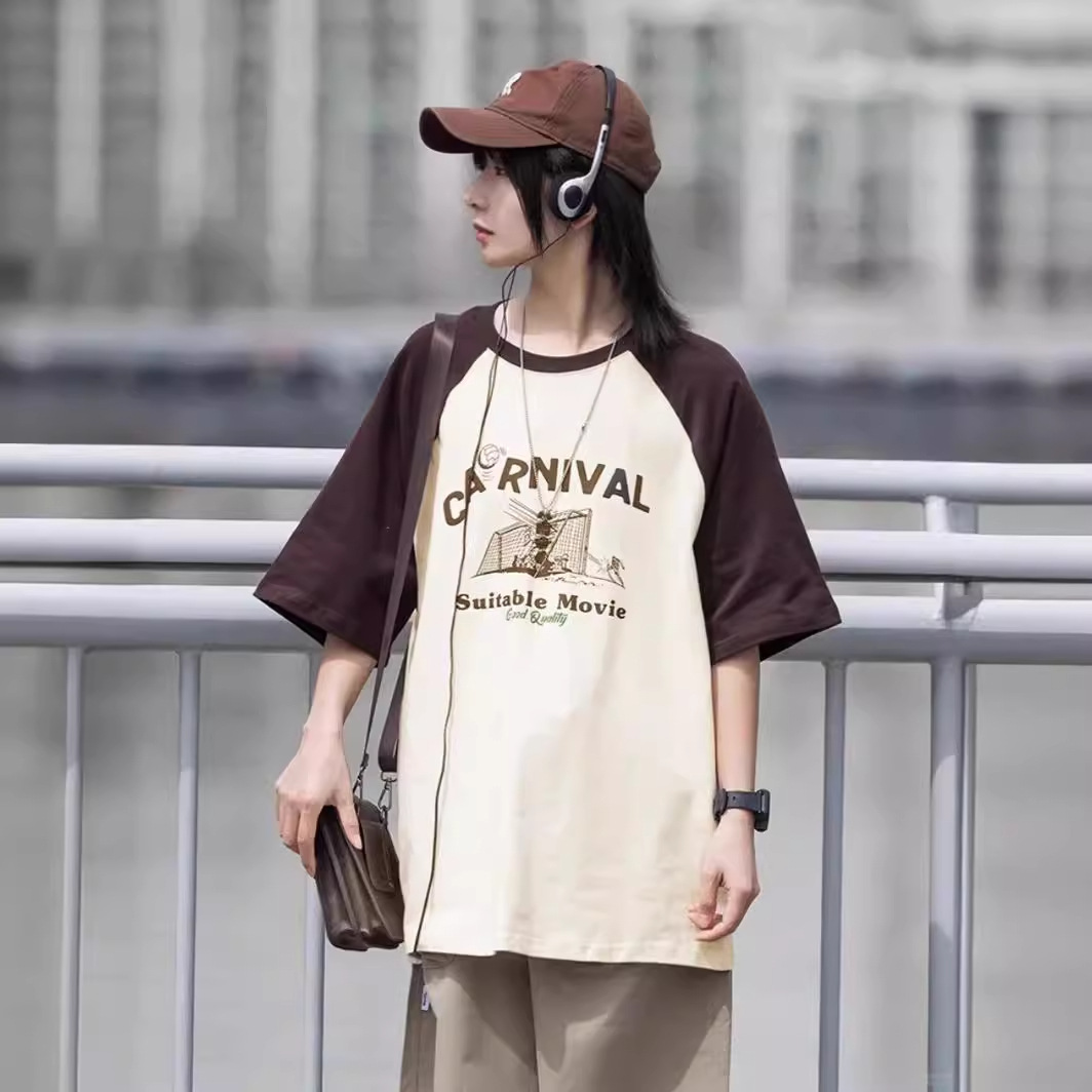 美式复古慵懒风chic插肩袖t恤男女春夏新款小个子宽松大码圆领上