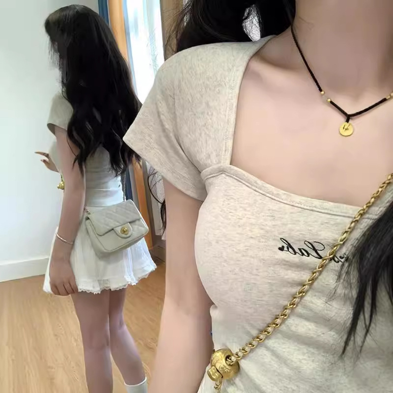 辣妹刺绣方领正肩短袖t恤女夏季小个子修身显瘦小飞袖短袖bm上衣