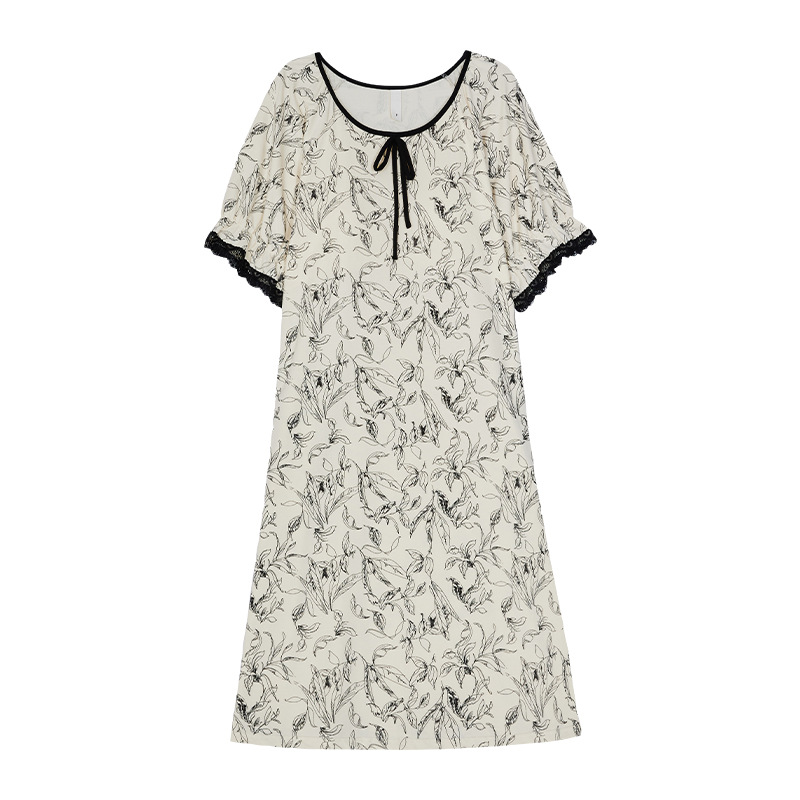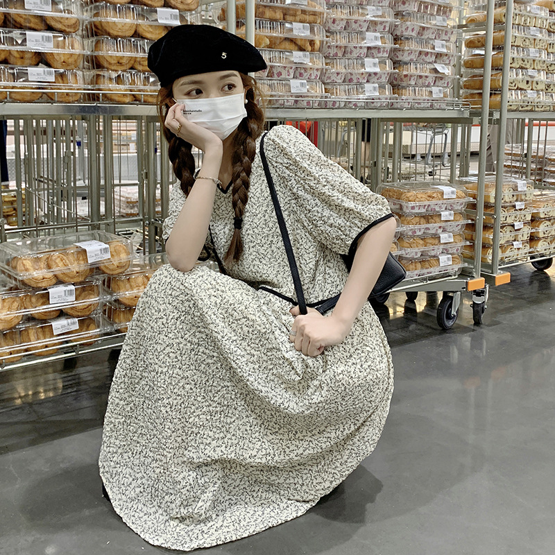 法式清新田园风碎花裙夏季新款撞色圆领宽松泡泡袖休闲连衣裙