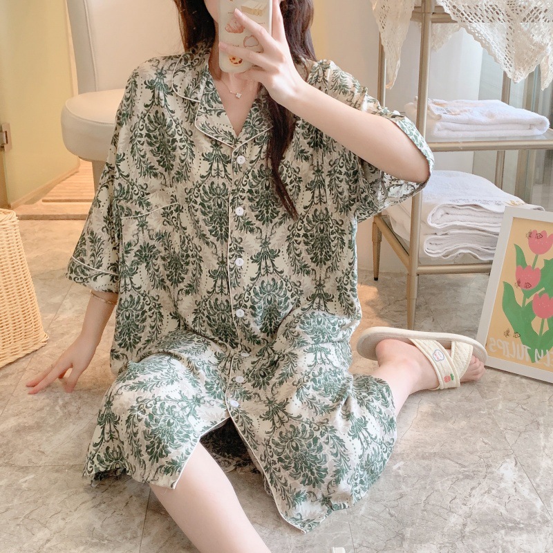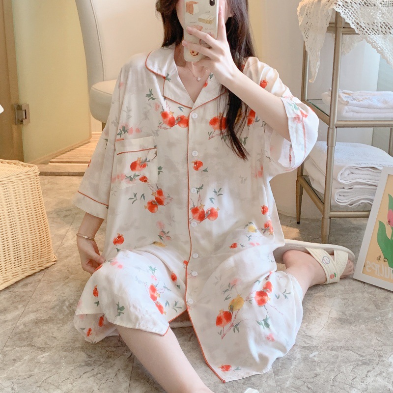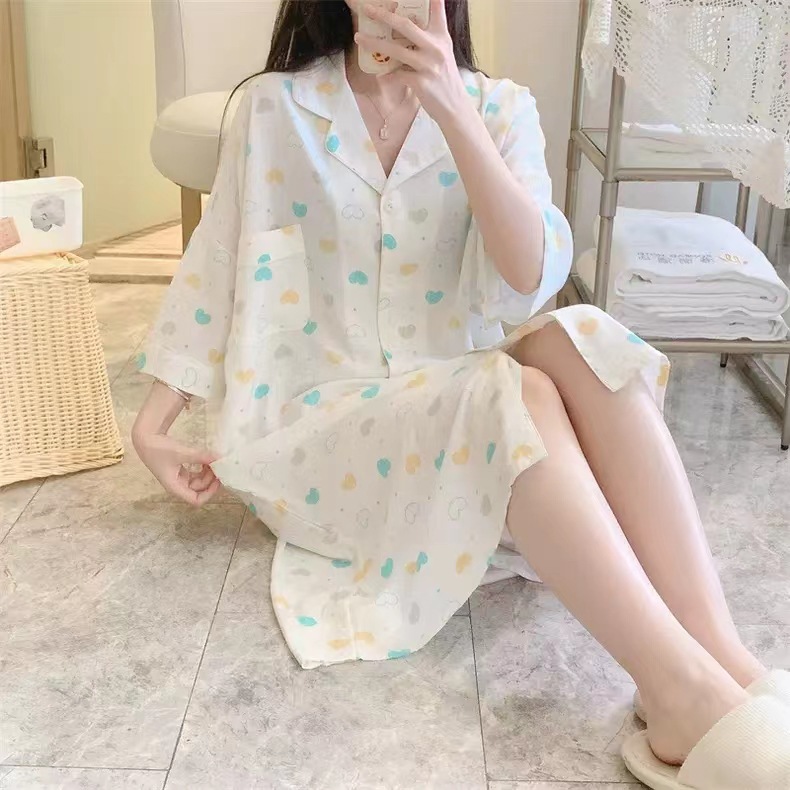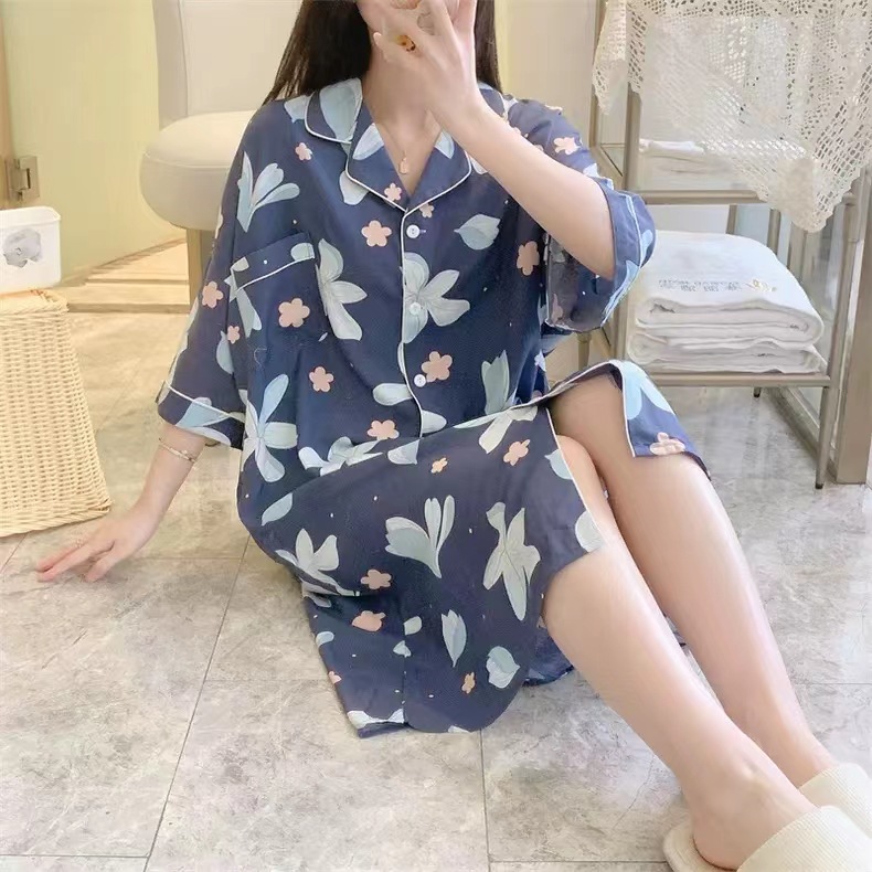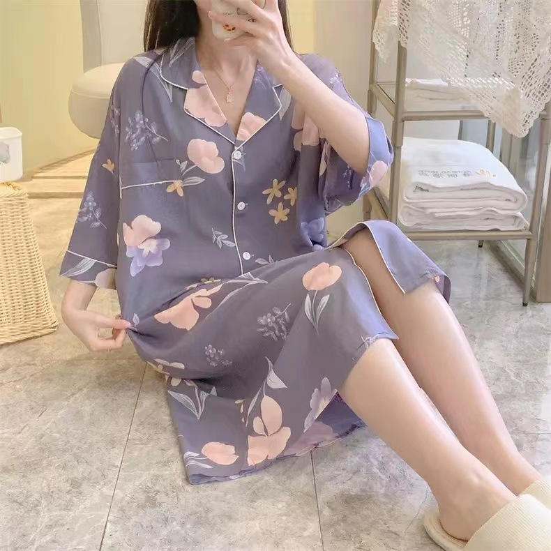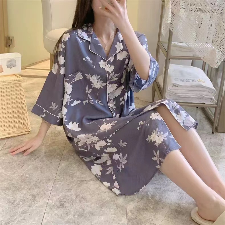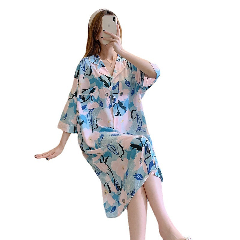 欧版棉绸睡裙女夏季薄款短袖开衫大码衬衫裙春秋可外穿绵绸家居服