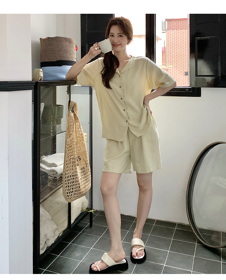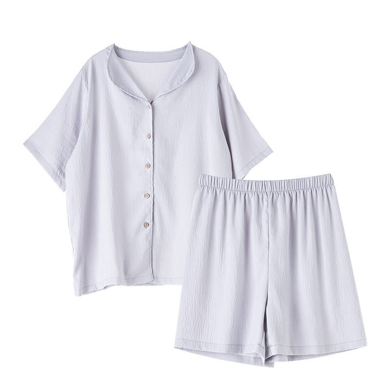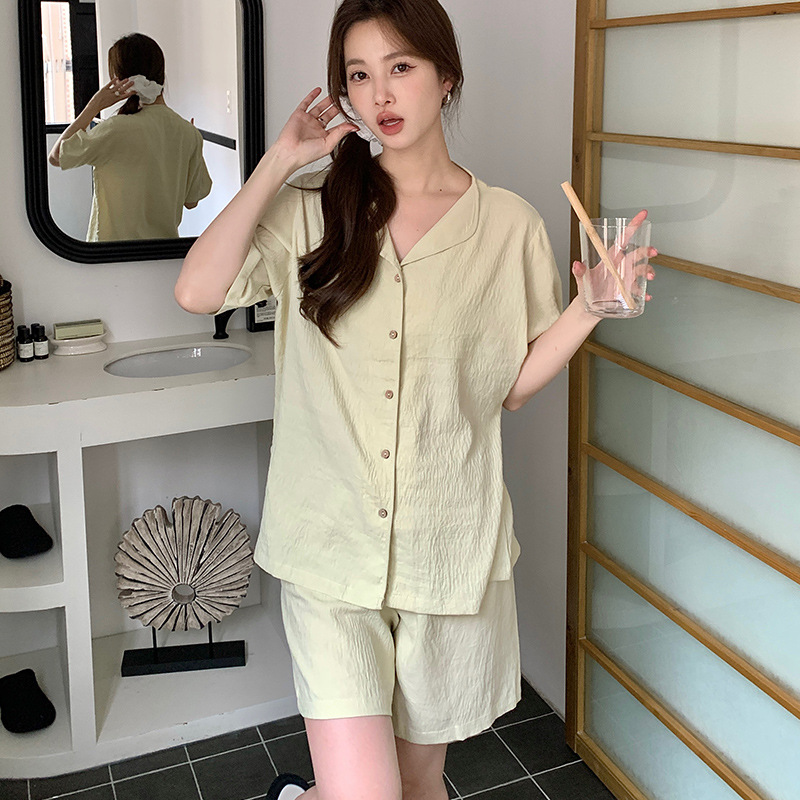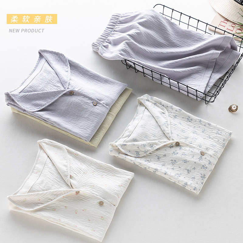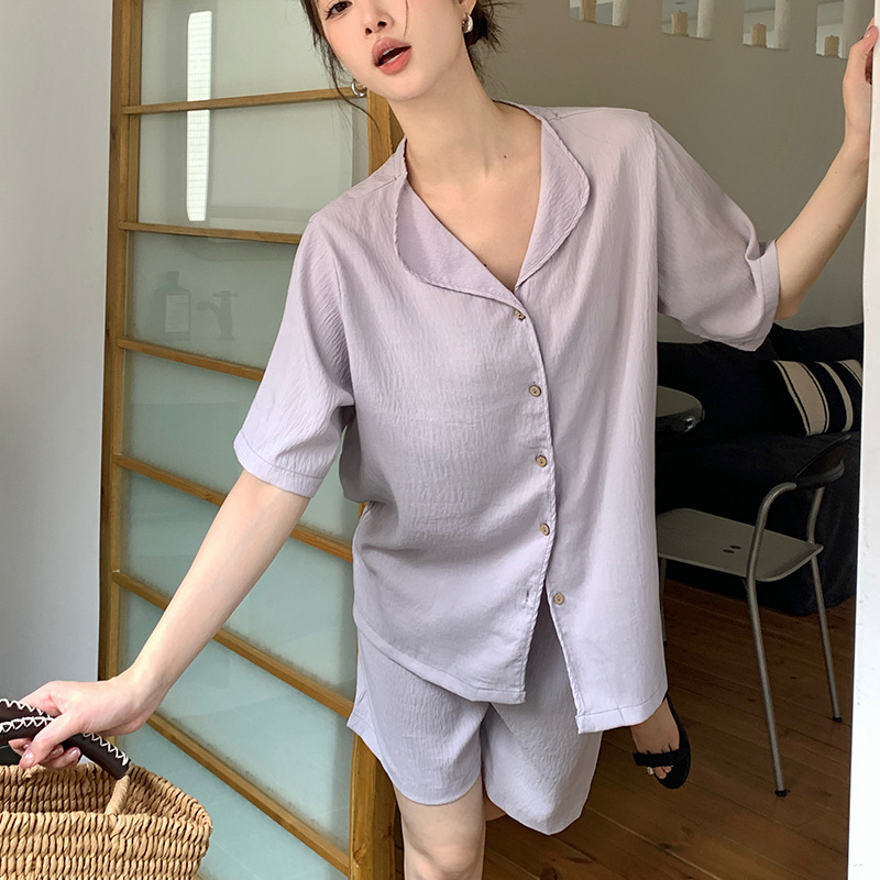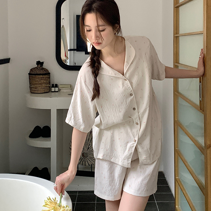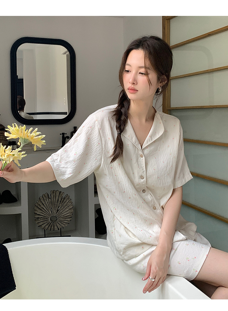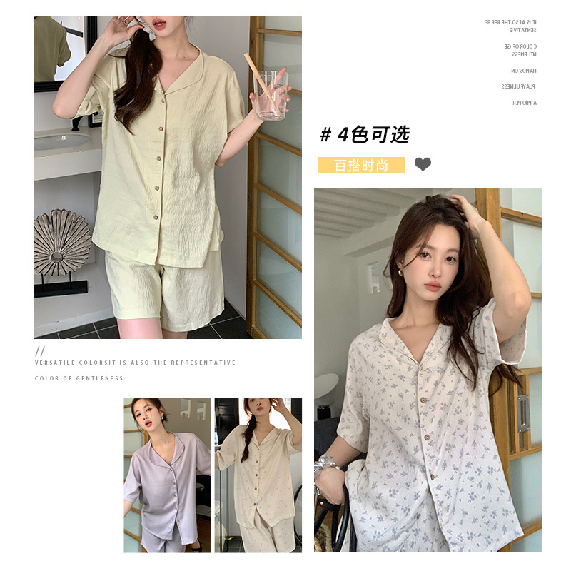 春夏纽扣家居服女新款宽松短袖开衫上衣套装印花短裤外穿翻领睡衣
