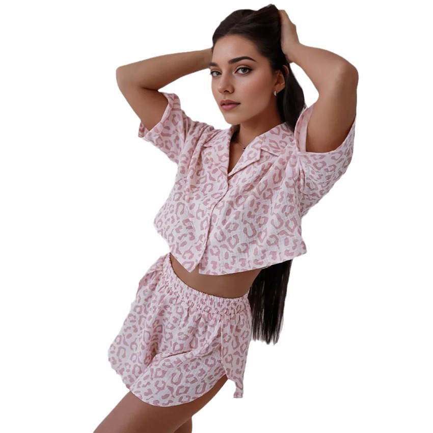 跨境夏季清凉纯棉女睡衣套装短款短袖开衩短裤两件套印花女家居服